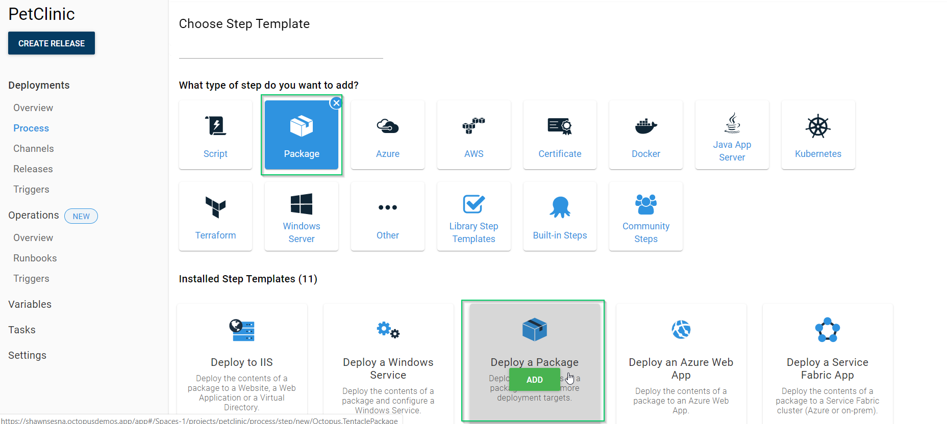 Choose the Package category and the Deploy a Package step:
