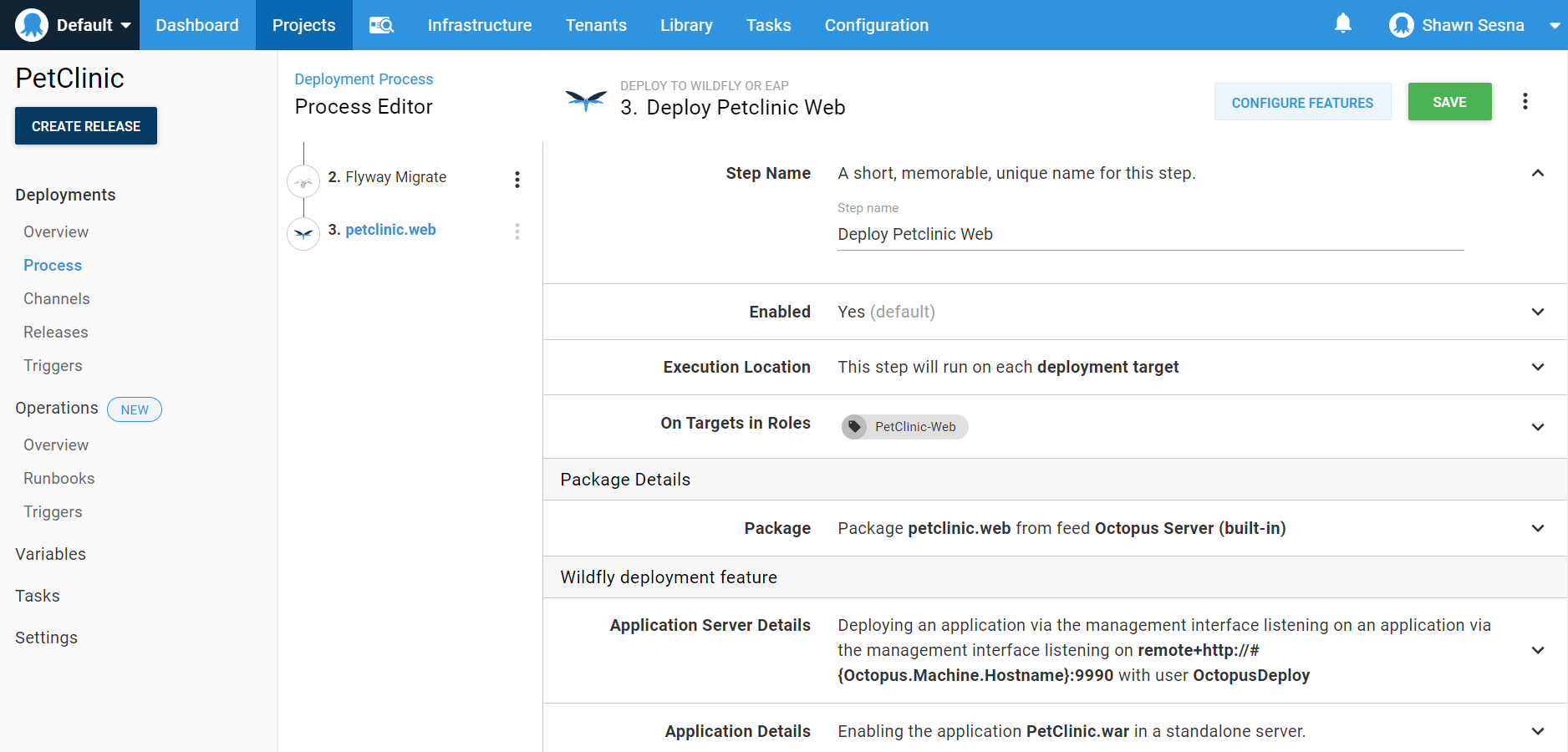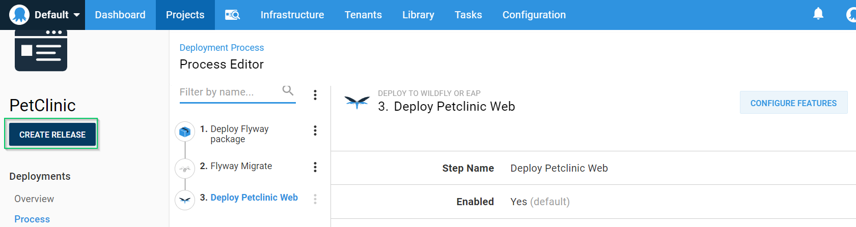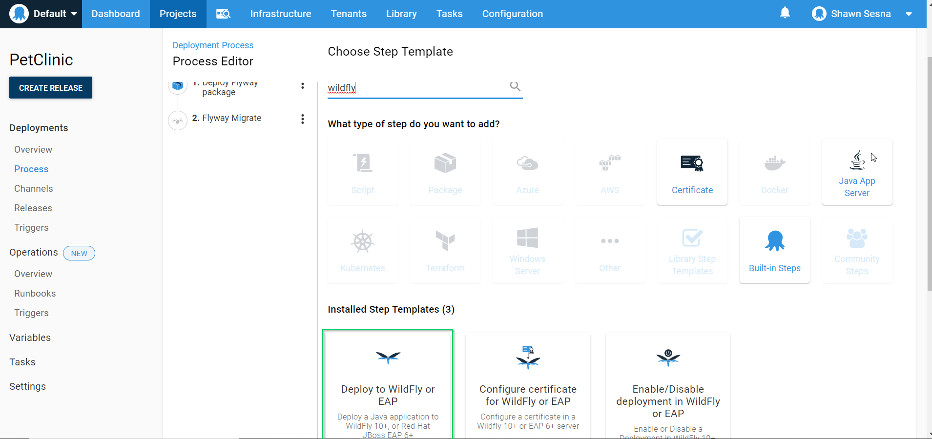 Octopus Deploy has built-in steps for the two most popular web servers for Java-based applications, Tomcat and JBOSS/Wildfly. This demonstration makes use of the Wildfly step.