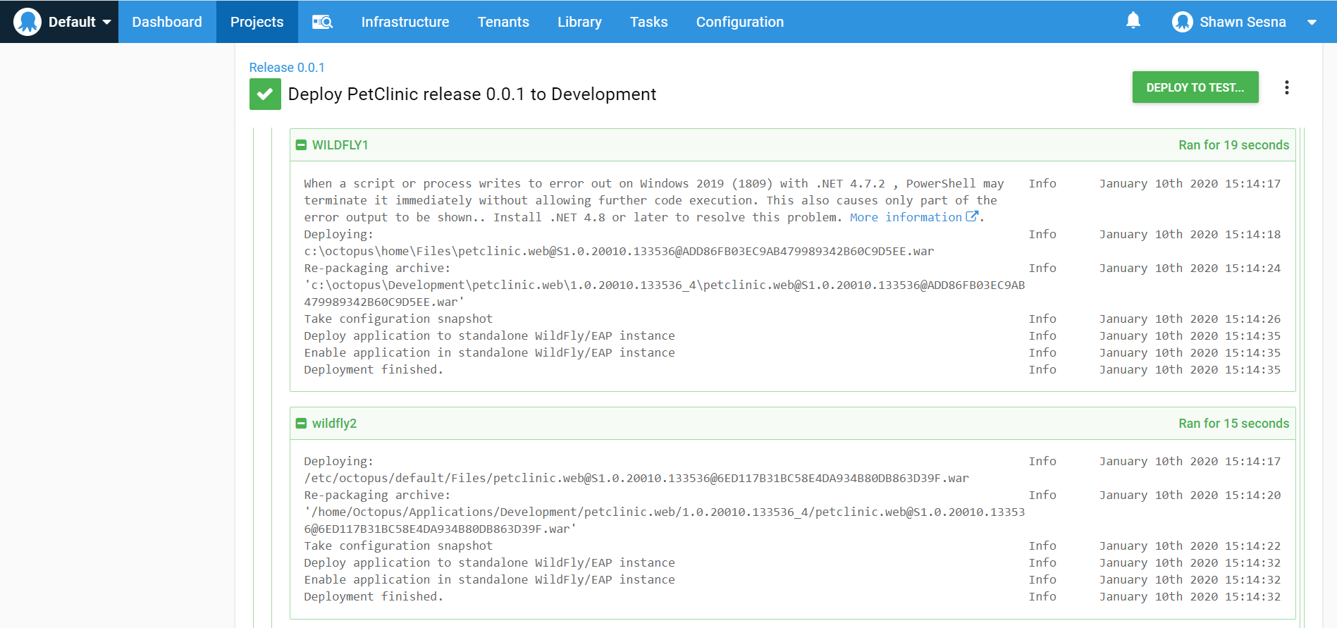 Note the deployment to the web server got deployed to two servers, Wildfly1 (Windows) and Wildfly2 (Linux).