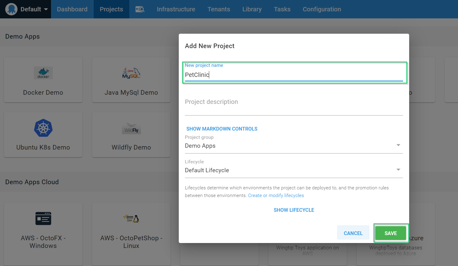 Give the project a name then click SAVE. Optionally, you can select which project group to put it in and which Lifecycle to use: