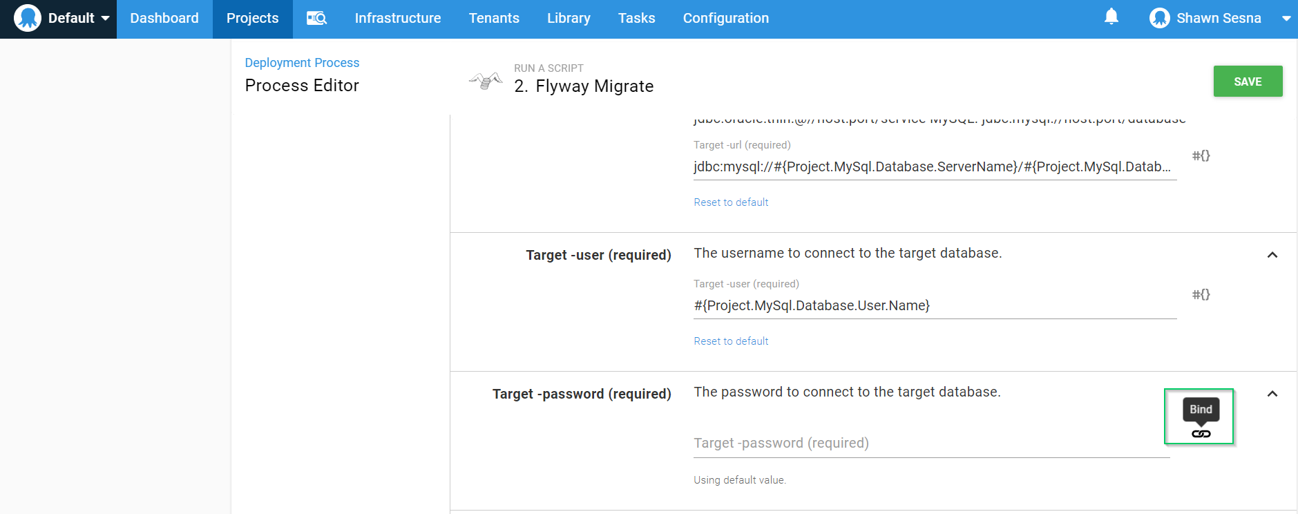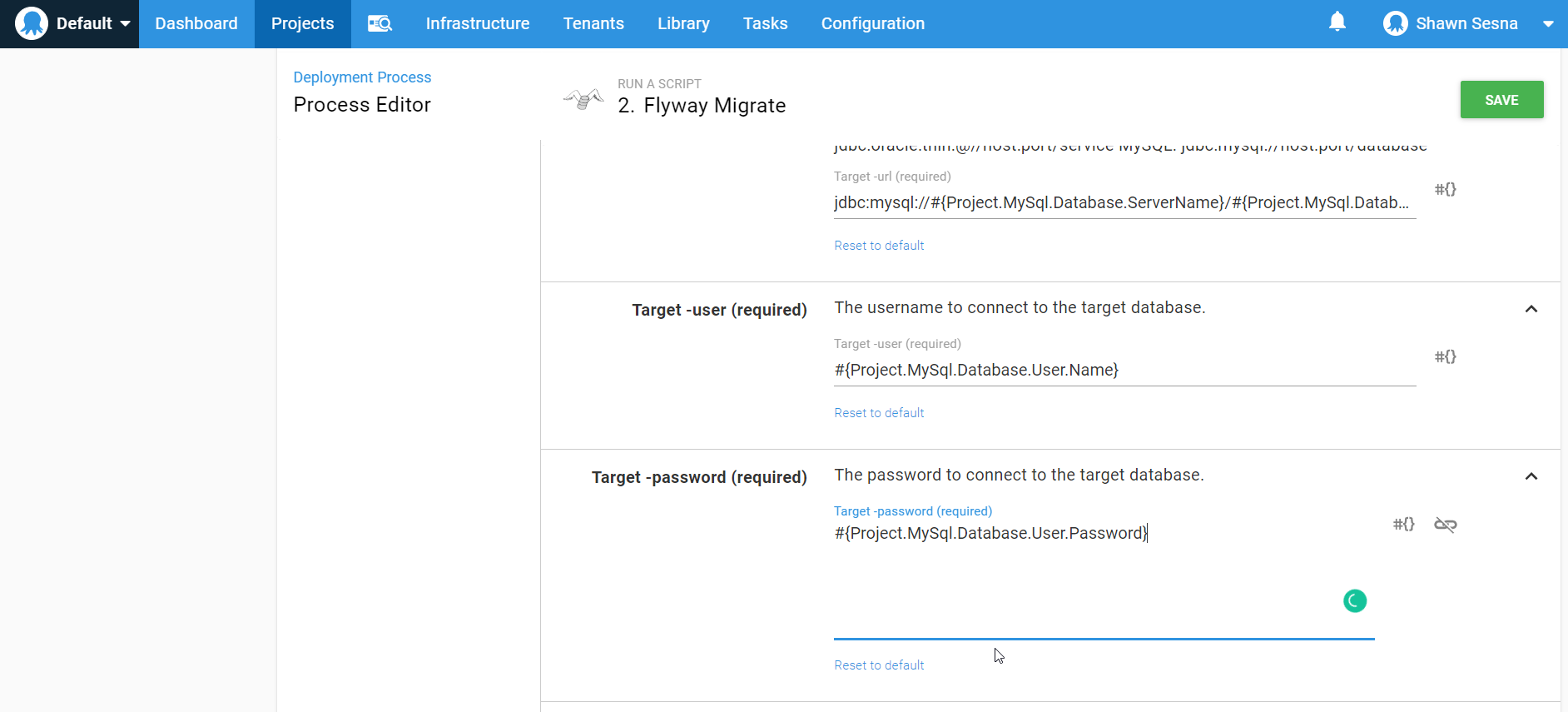 jdbc:mysql://#{Project.MySql.Database.ServerName}/#{Project.MySql.Database.Name}?useUnicode=true - Target -user: