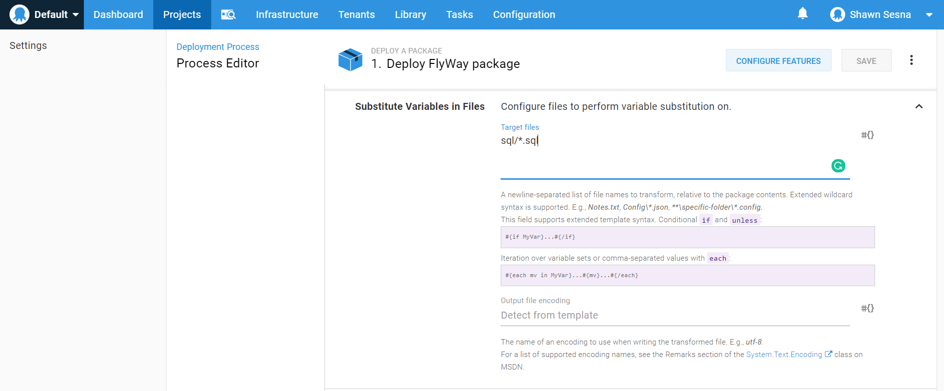 Click OK, then scroll down and expand the Substitute Variables in Files section. For Target files, enter the value sql/*.sql and click SAVE: