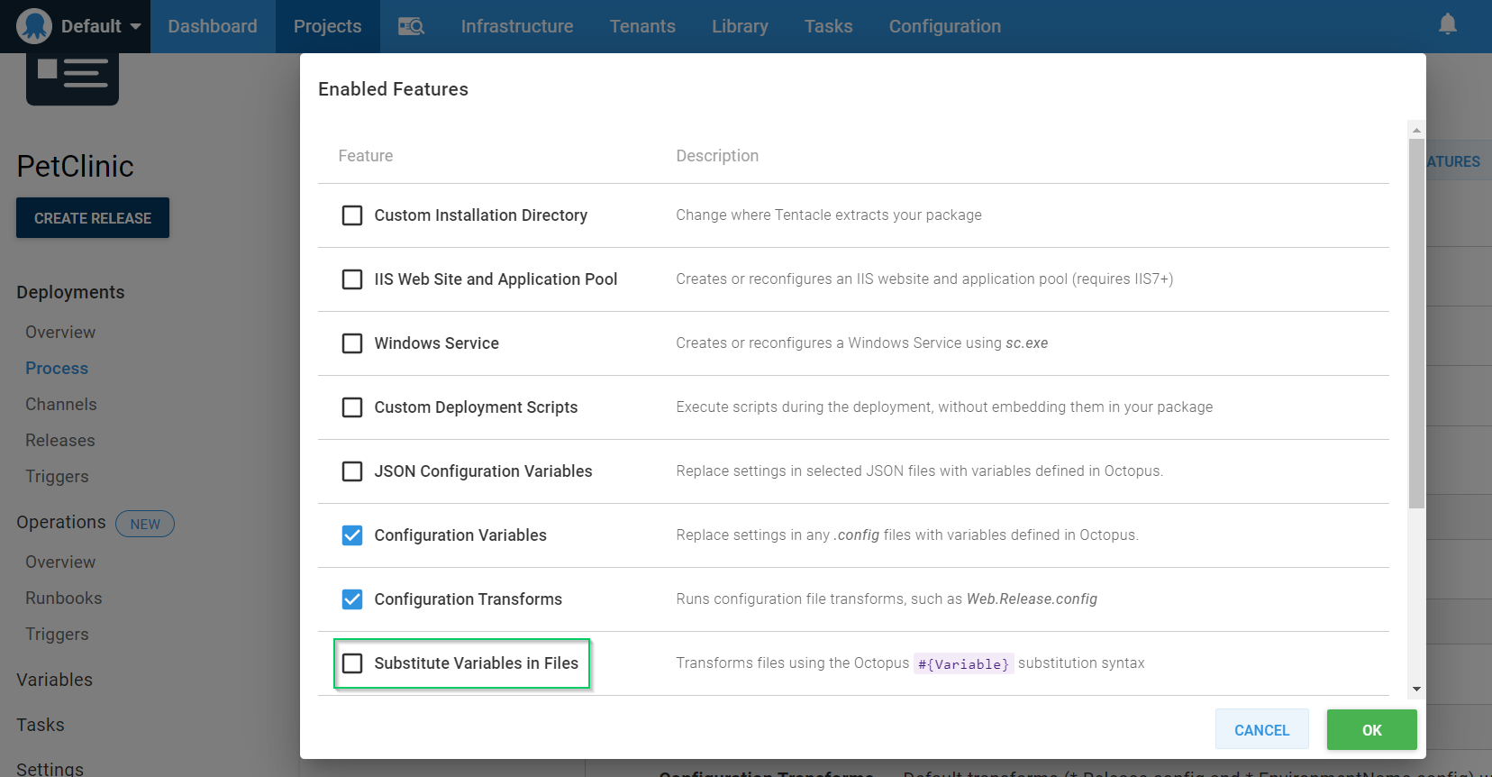 There’s one last thing to configure for the Wildfly step, replace the #{} variables in the datasource-config.xml. Click the CONFIGURE FEATURES button and select the Substitute Variables in Files as we did in the Deploy a Package step. In the Target files section, enter the following value