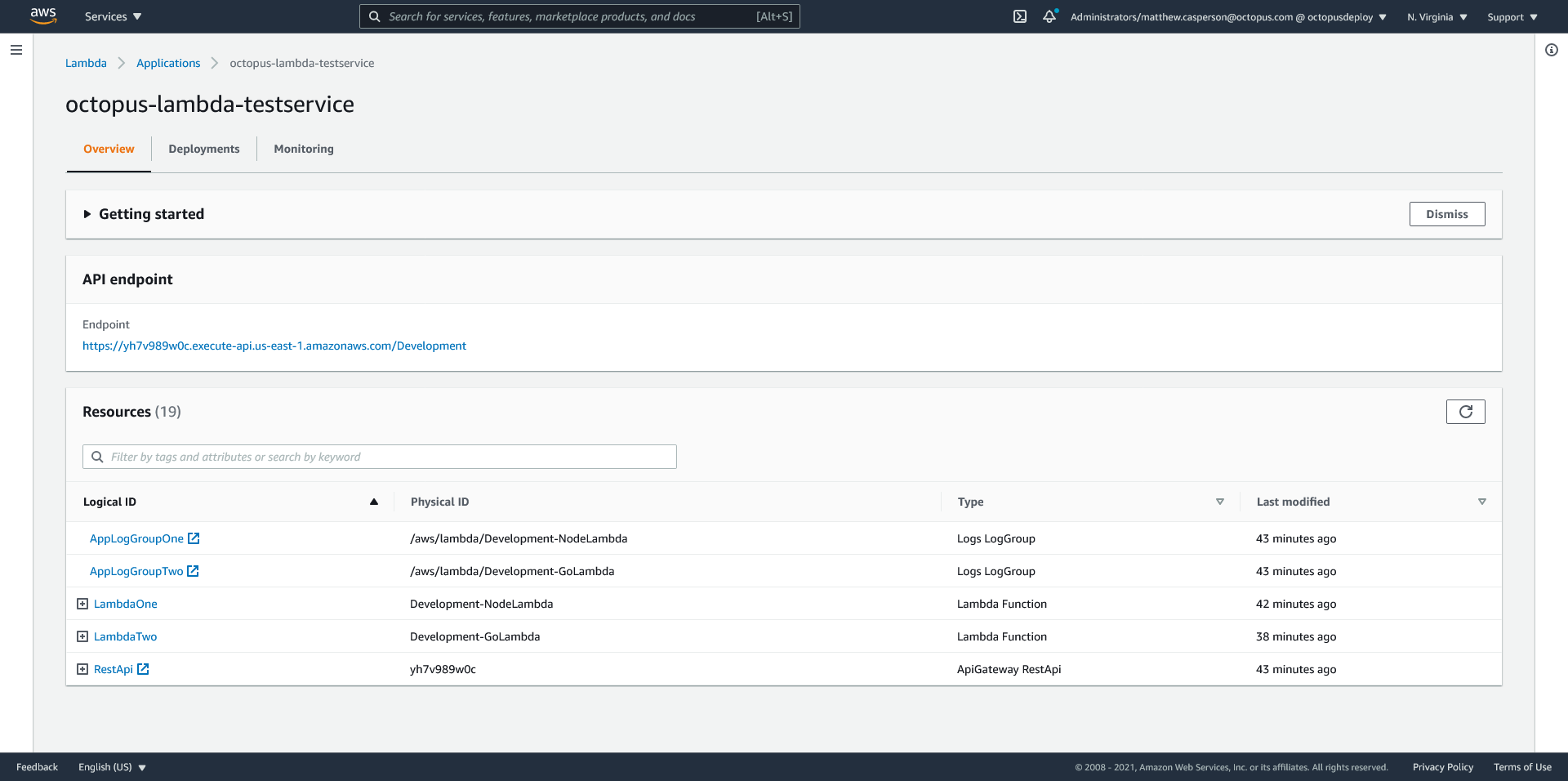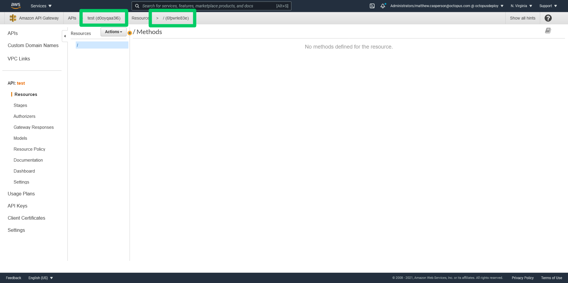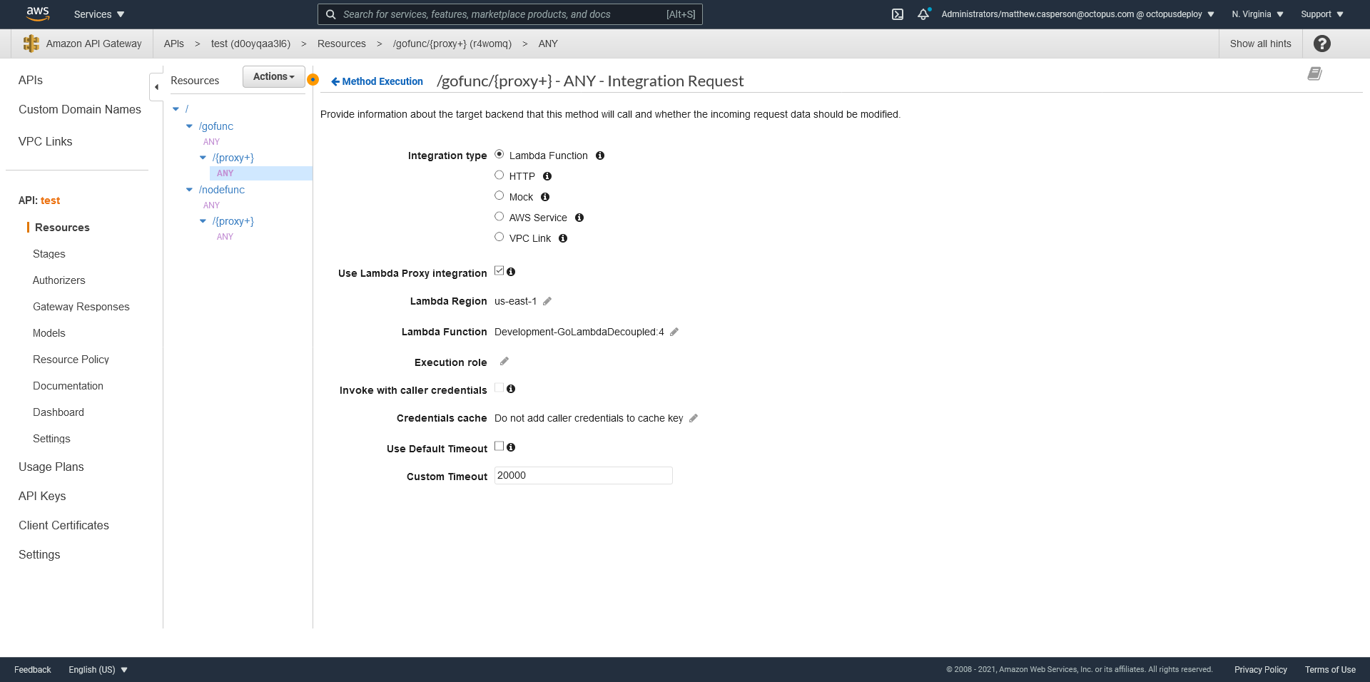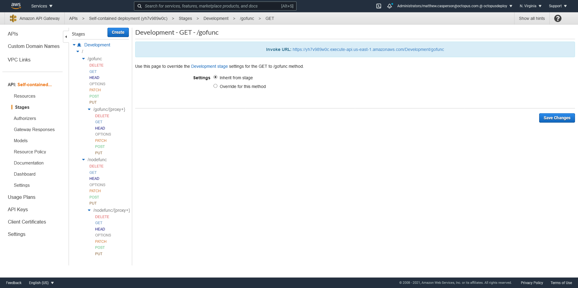 Deploying the template above through Octopus to an environment called Development creates an API Gateway with a stage called Development with a resource hierarchy creating the paths /gofunc/* and nodefunc/*: