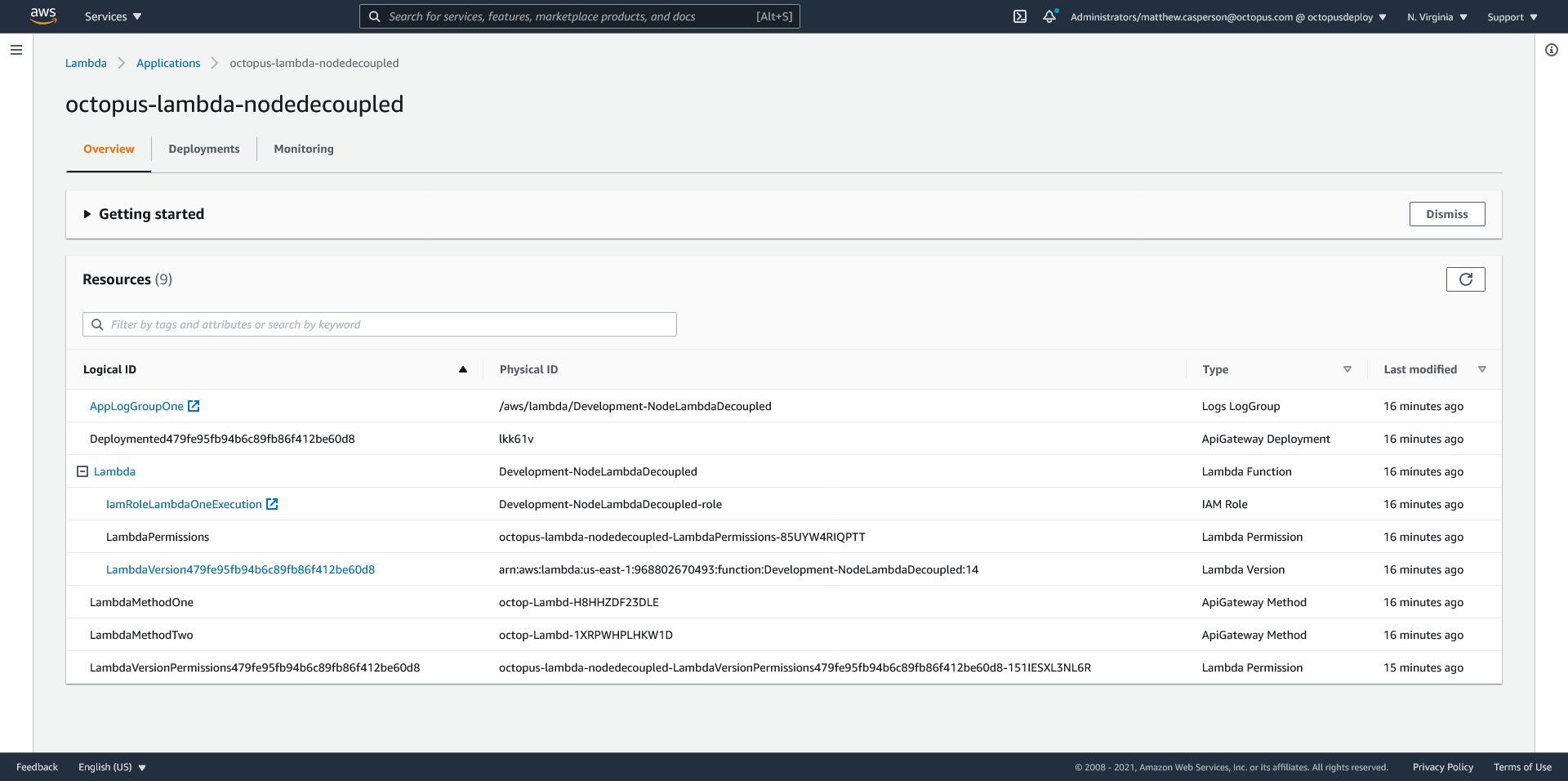 As with the self-contained deployments, AWS recognizes the resources created via a CloudFormation template as an application. With a decoupled deployment though we only see the individual Lambda resources, and not the API Gateway: