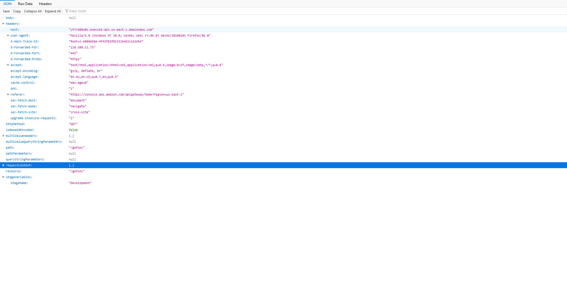 The Lambdas have been written to return the object that API Gateway passed as input in the response body. This allows us to inspect the details of the object that API Gateway built with its proxy integration: