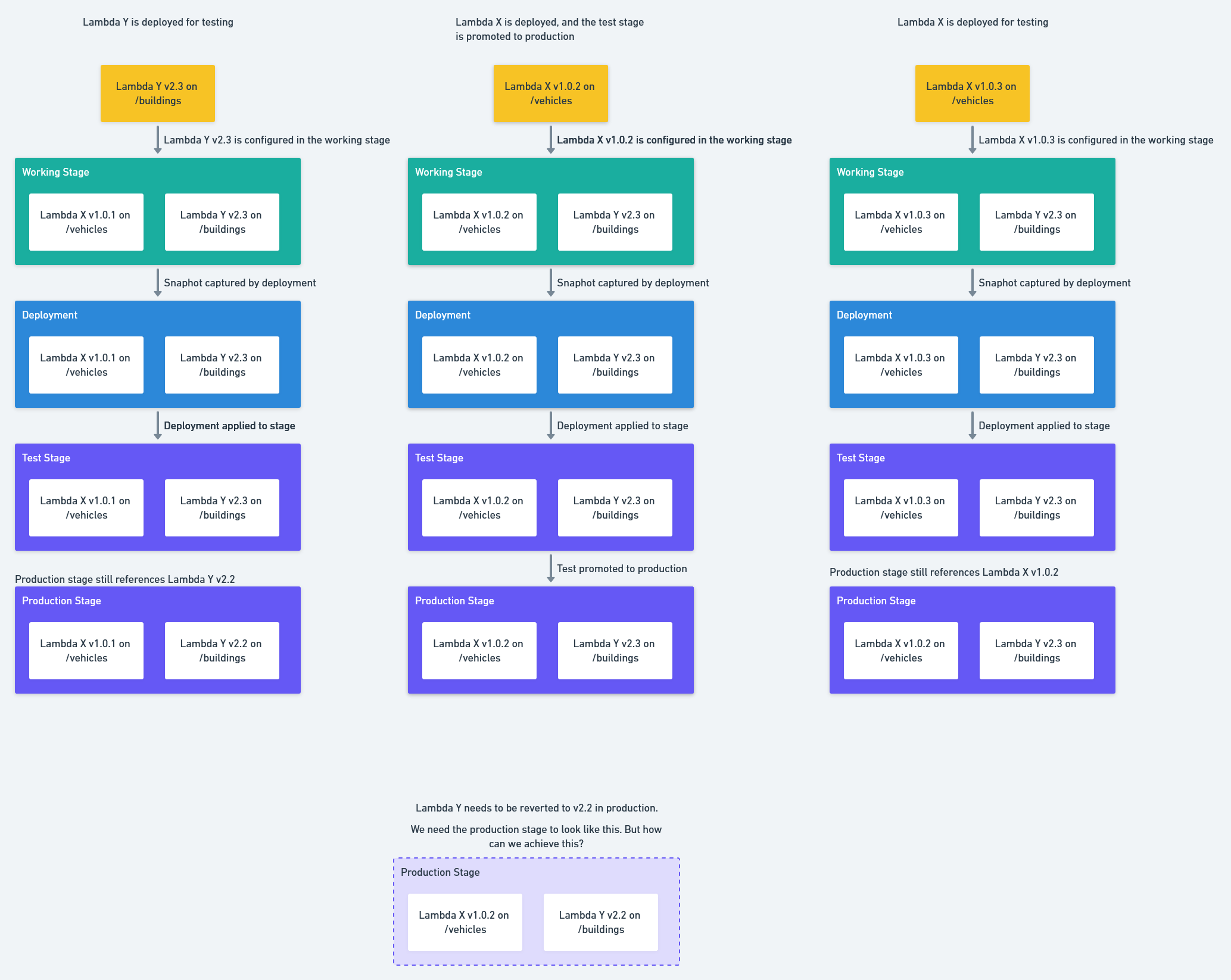 It is tempting to think that we could simply assign an old AWS::ApiGateway::Deployment resource to the production stage. But what if several other teams promoted their Lambda version to production before you realized you needed to roll your Lambda back? There is now no AWS::ApiGateway::Deployment resource with the correct combination of Lambda versions and API Gateway settings that we can roll back to: