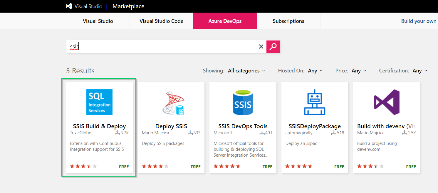 After we have Visual Studio on our build agent, we need to install an extension called SQL Server Data Tools (SSDT). When that has been installed, our build agent will have the ability to build .dtsproj projects.