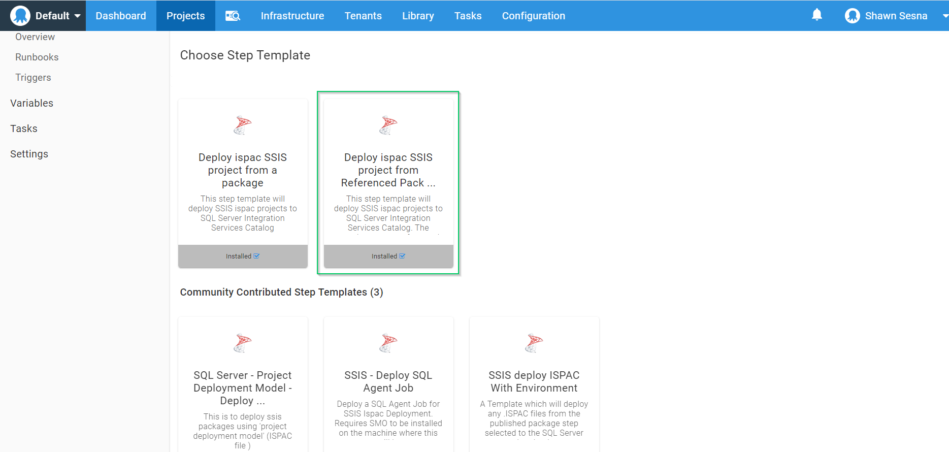 Filtering by SSIS will show the available SSIS step templates. For this demonstration, I use Deploy ispac SSIS project from Referenced Package. This template will allow us to deploy using a worker instead of installing an agent on the SSIS server.