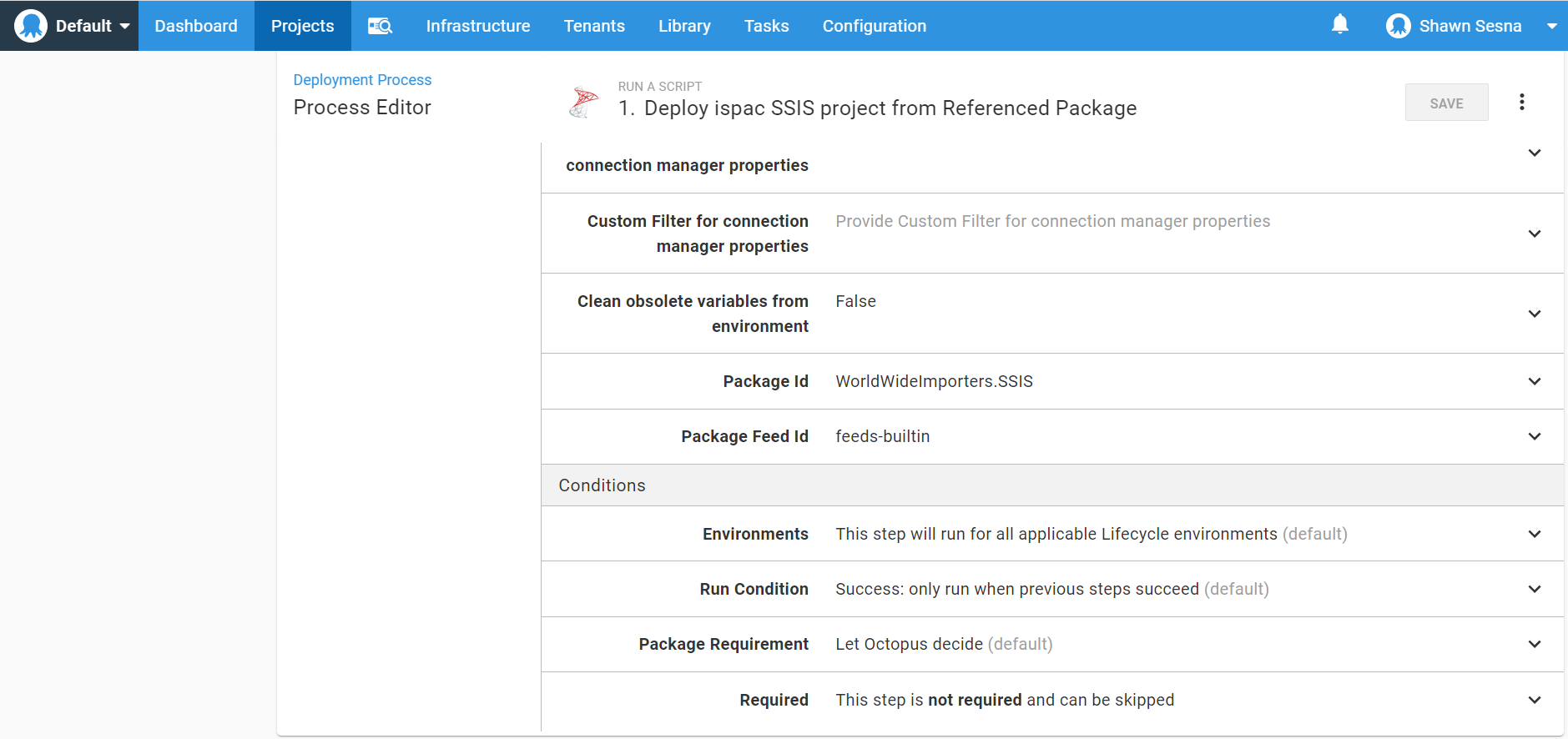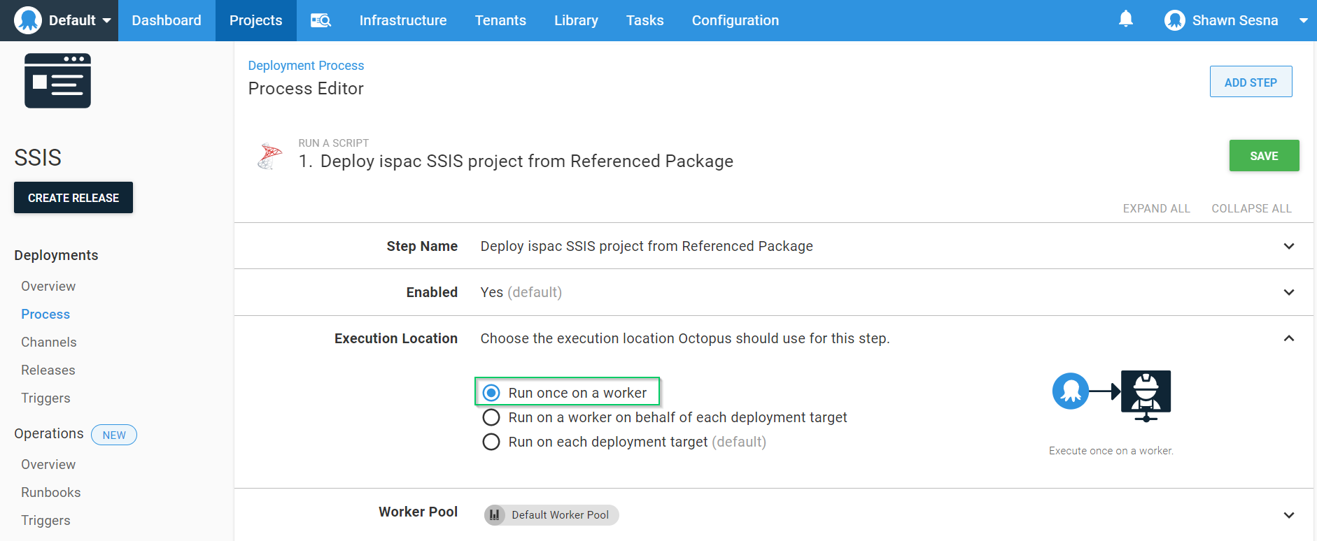 This step allows us to run the step on either a deployment target or a worker. For this demonstration, I use a worker, so we don’t need to install a Tentacle on the SSIS server itself. Expand the Execution Location section and select Run once on a worker.