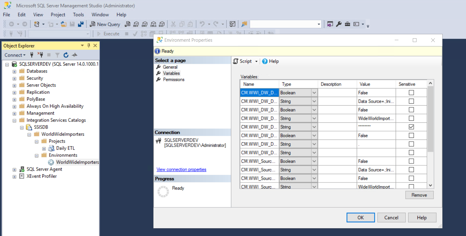 Creating the variables by hand can sometimes be time consuming. See my importing variables from SSISDB post to automate variable creation.