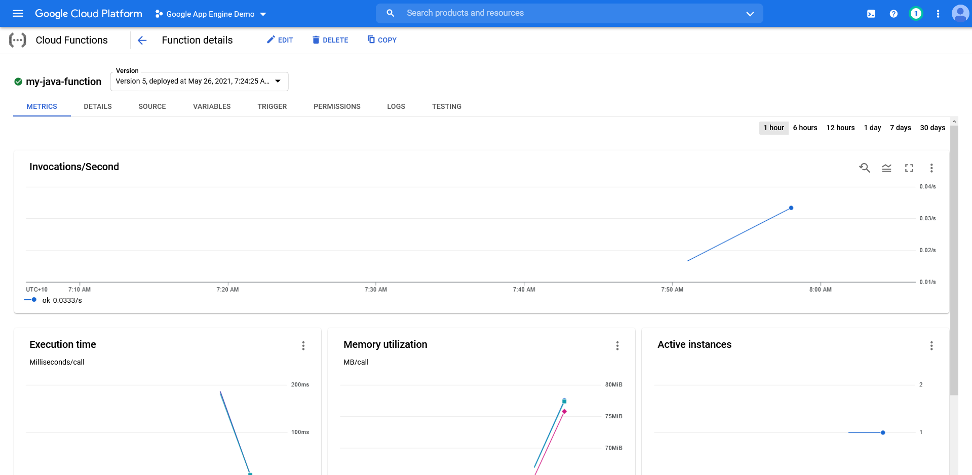 After the function is deployed, it’s displayed in the GCP console: