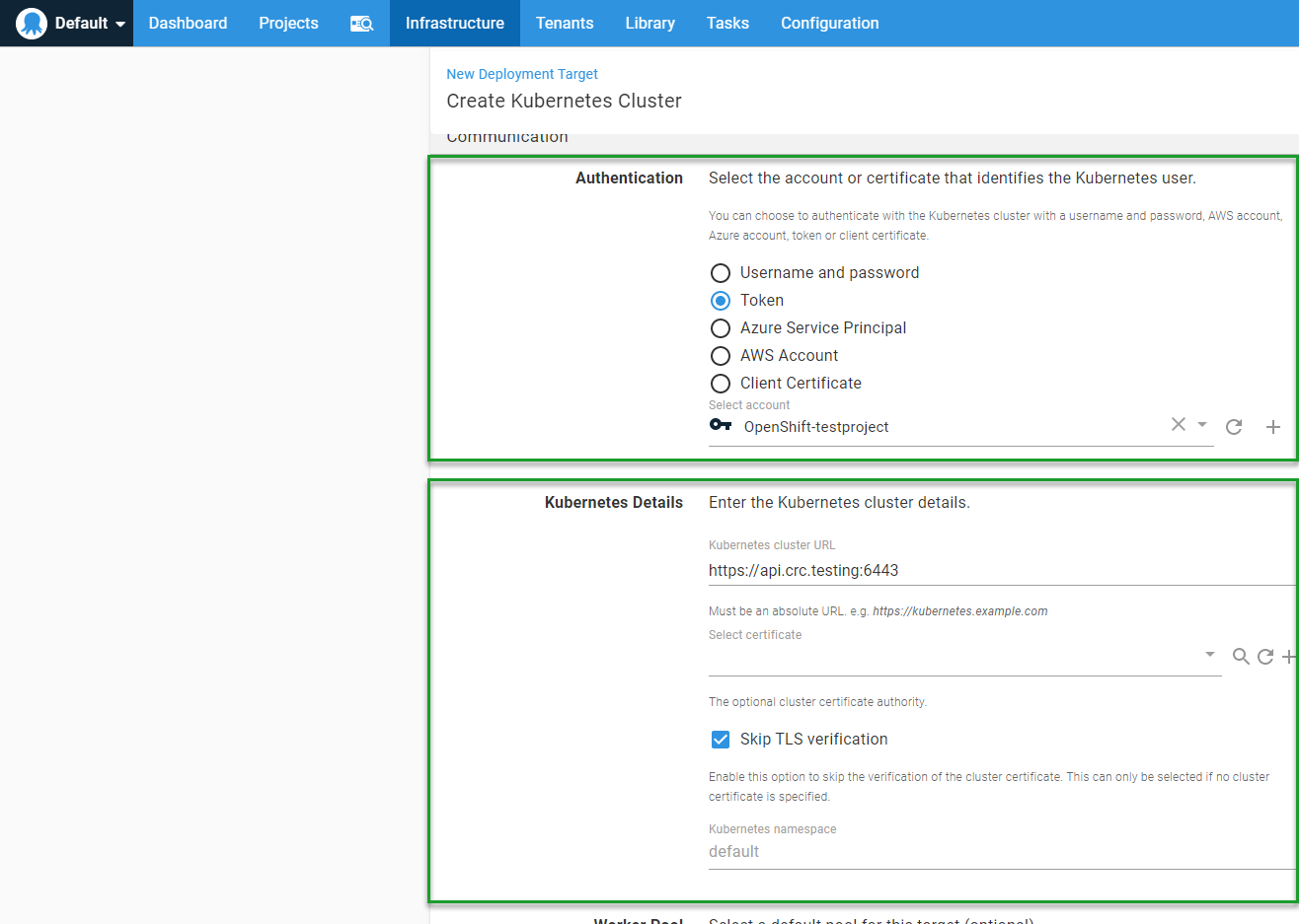 Connecting OpenShift to Octopus Deploy is achieved by following the same procedure you would use for any other K8s cluster. First, create an account, and then add a K8s cluster target.