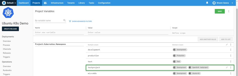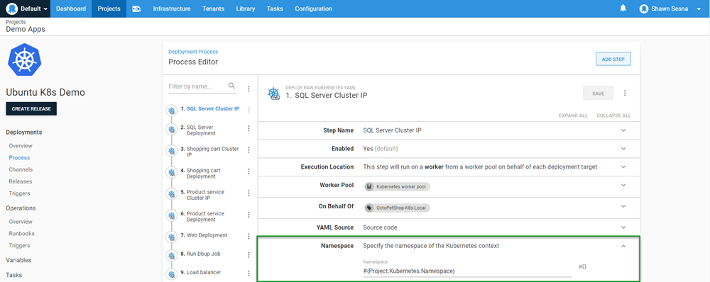 Just like in the Rancher post, I use the same deployment process from the Beyond Hello World: Build a real-world Kubernetes CI/CD pipeline post. I add a value of testproject to the Project.Kubernetes.Namespace variable to scope it specifically to our new target: