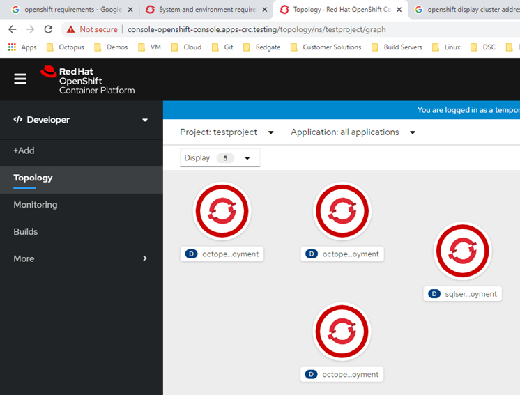There is a stripped down version of OpenShift that is designed to run on a laptop for development and trial purposes called CodeReady Containers (CRC). The CRC version is what I used for this post as my hypervisor didn’t have enough remaining resources to host the full version of OpenShift. Even though it is a stripped down, CRC still has the same overall functionality.