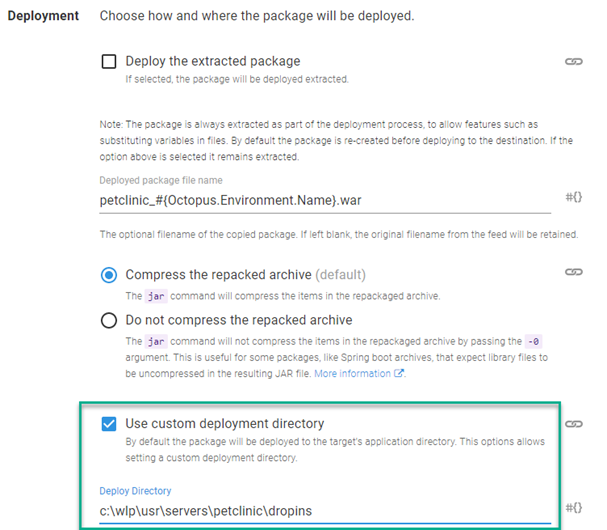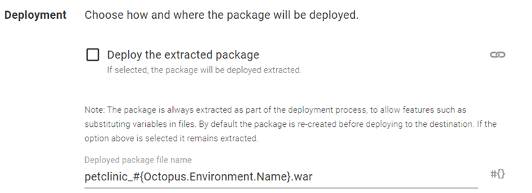 If you want the name to be more useful, fill in the Deployed package file name. In my case, I wanted the environment name to be included so I used petclinic_#{Octopus.Environment.Name}.war: