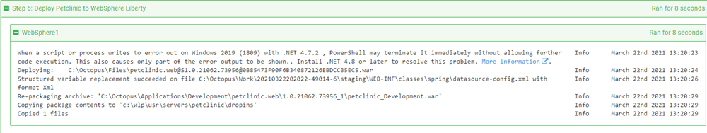 With our process defined, we can now deploy our application to our server. When the deployment is complete, you should see the following output for the deployment of the PetClinic web application: