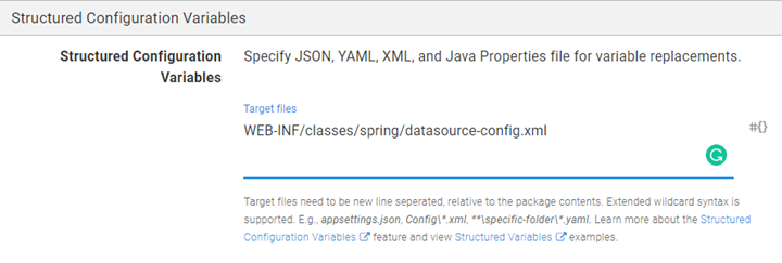 Scroll to the Structured Configuration Variables section that was just added to the form and enter WEB-INF/classes/spring/datasource-config.xml for the value: