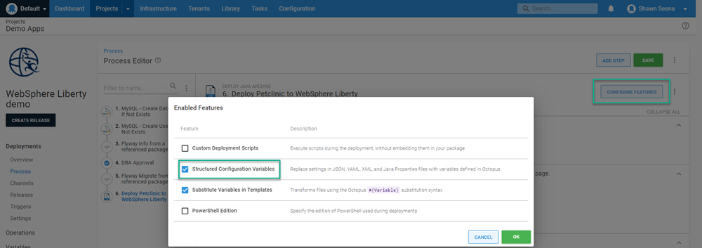 The PetClinic application needs the WEB-INF/classes/spring/datasource-config.xml file updated with the database server, username, and password details. To do this, we’ll use the Structured Configuration Variables feature. Scroll to the top of the step and click CONFIGURE FEATURES. Enable the Structured Configuration Variables feature and click OK: