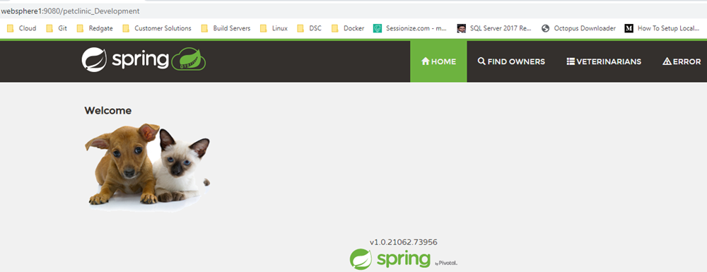 The default port for WebSphere Liberty is 9080. Navigation to http://websphere1:9080/petclinic_Development shows that our application has been deployed:
