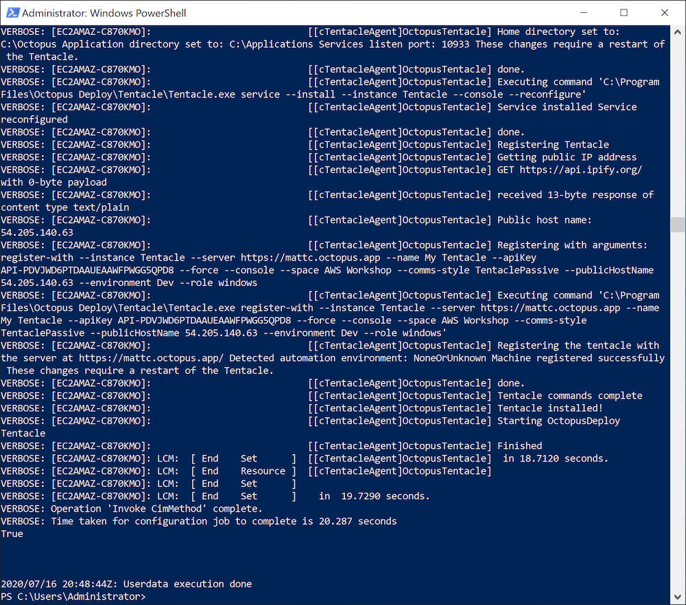 The log files for the user data script are found in C:\ProgramData\Amazon\EC2-Windows\Launch\Log\UserdataExecution.log. If we view the contents of this file in the newly created EC2 instance, we’ll see the Tentacle being installed: