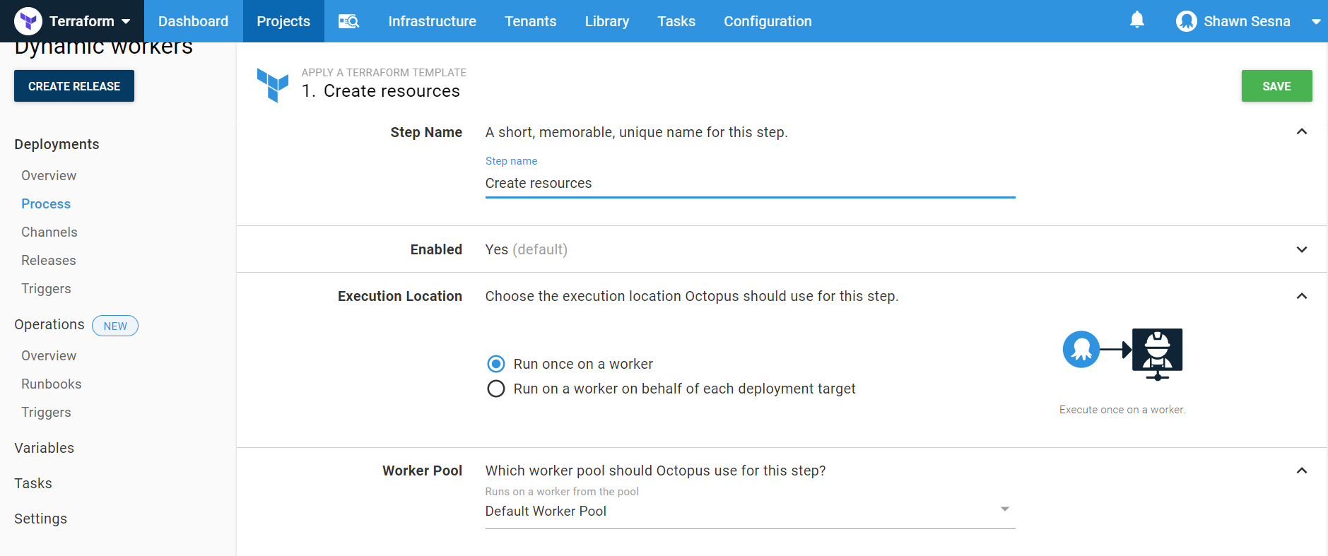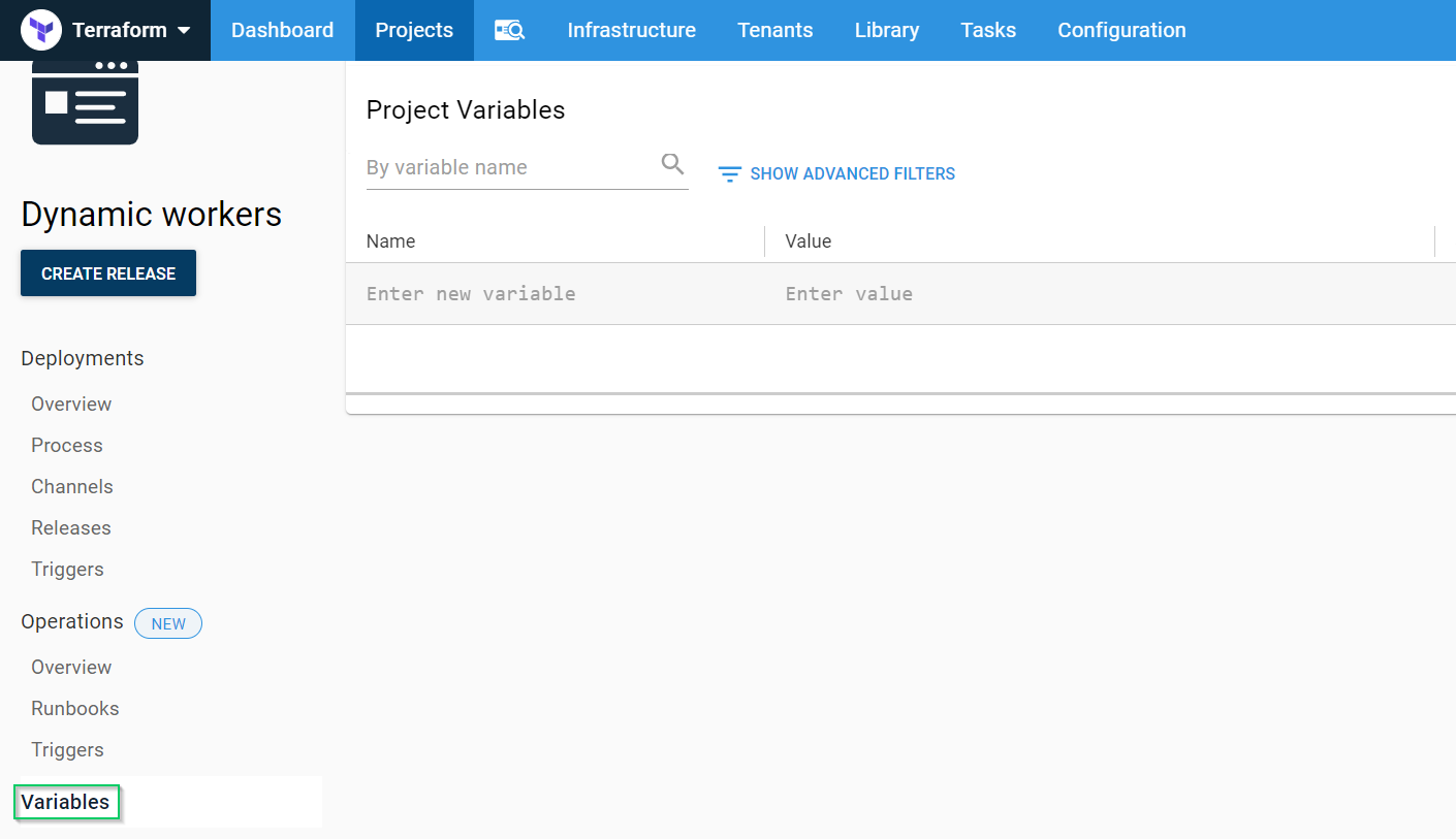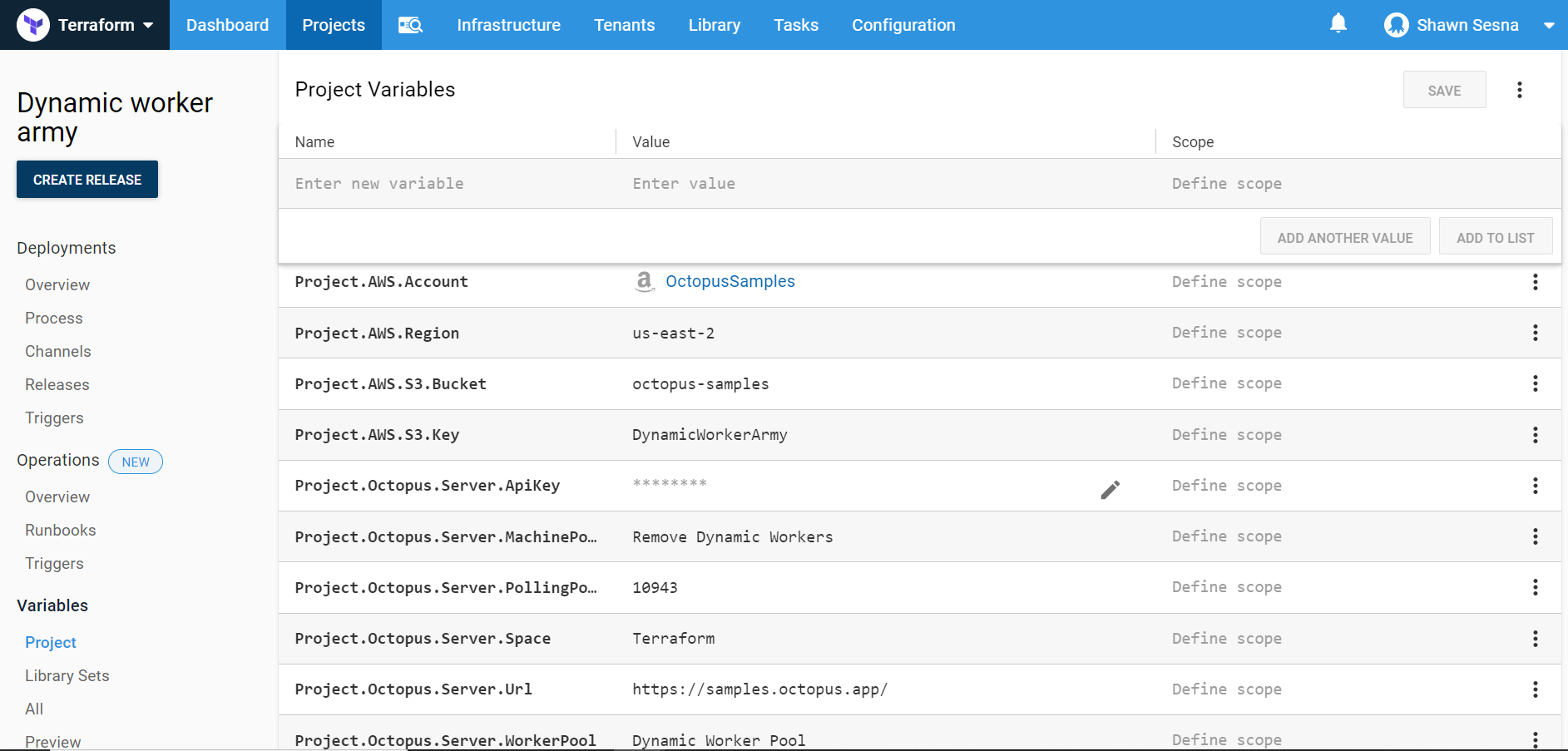 Project.AWS.Account: The AWS Account we created above.Project.AWS.Region: The region in AWS we’re using.Project.AWS.S3.Bucket: The bucket that we’re going to store our state files in.Project.AWS.S3.Key: The key that will store our state.Project.Octopus.Server.ApiKey: The API Key that will be used when connecting the worker to the Octopus server (sensitive).Project.Octopus.Server.MachinePolicy: The name of the Machine Policy the worker will be attached to.Project.Octopus.Server.PollingPort: The port that the Octopus server uses for Polling Tentacles.Project.Octopus.Server.Space: The name of the space the worker will be attached to (leave blank for default).Project.Octopus.Server.Url: The Octopus server URL.Project.Octopus.Server.WorkerPool: The name of the worker pool the worker will join.