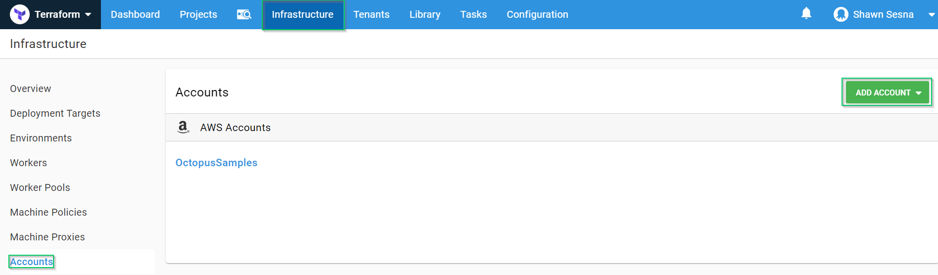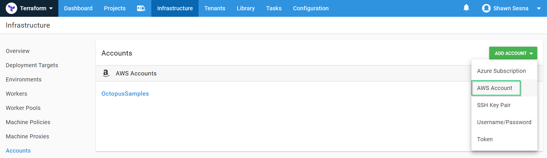 To work with AWS, we need an account with the necessary rights to create our resources. After that has been created in AWS, we need to add this account to Octopus Deploy. To do this, we’ll click {{Infrastructure > Accounts > ADD ACCOUNT}}: