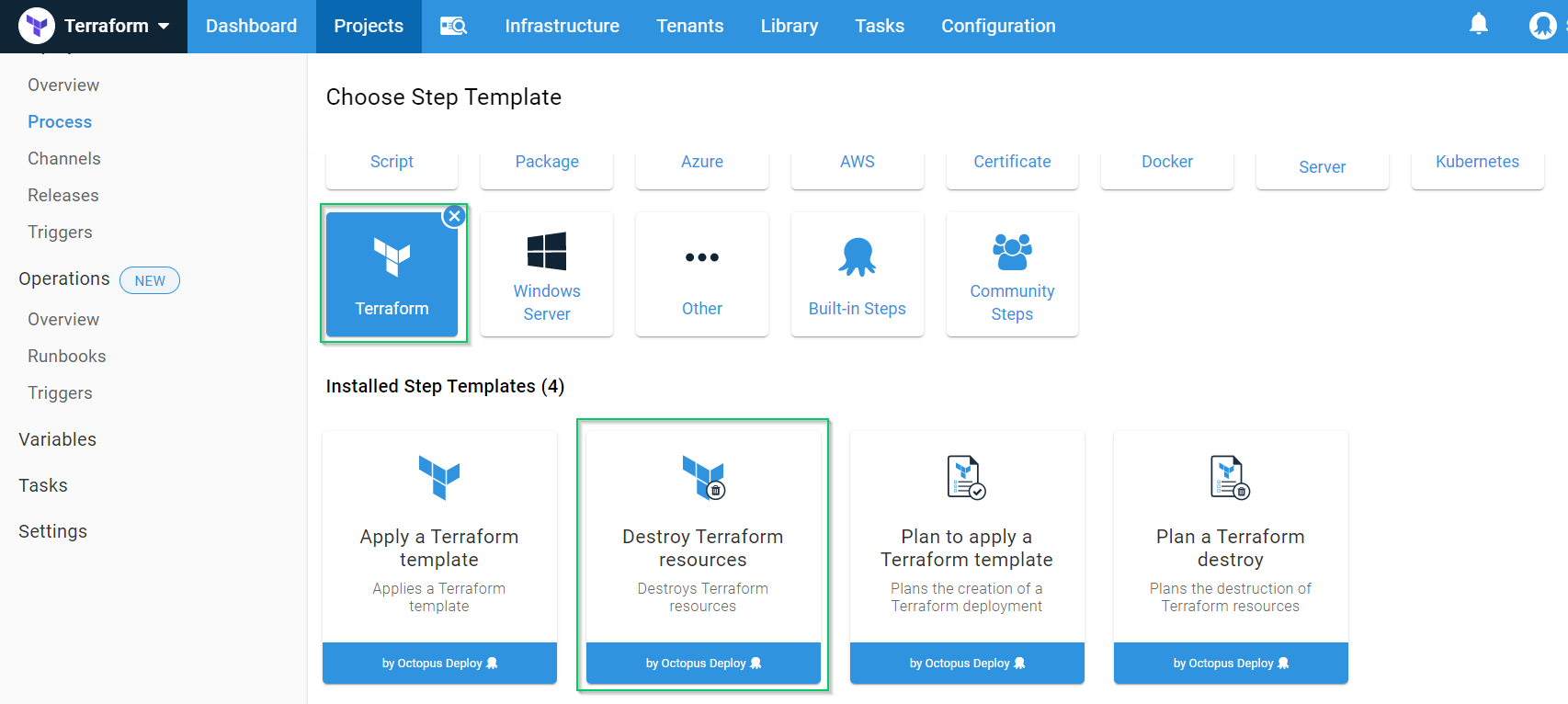 Click ADD STEP, choose the Terraform category, then choose Destroy Terraform resources: