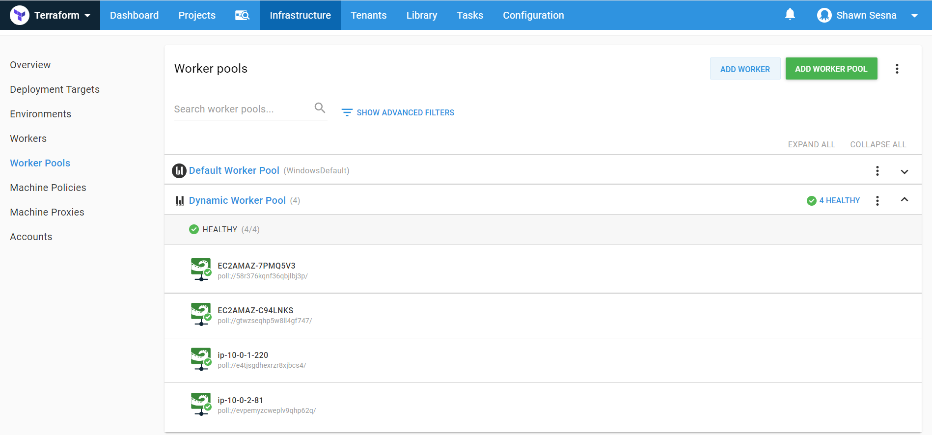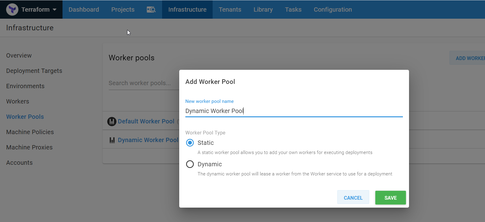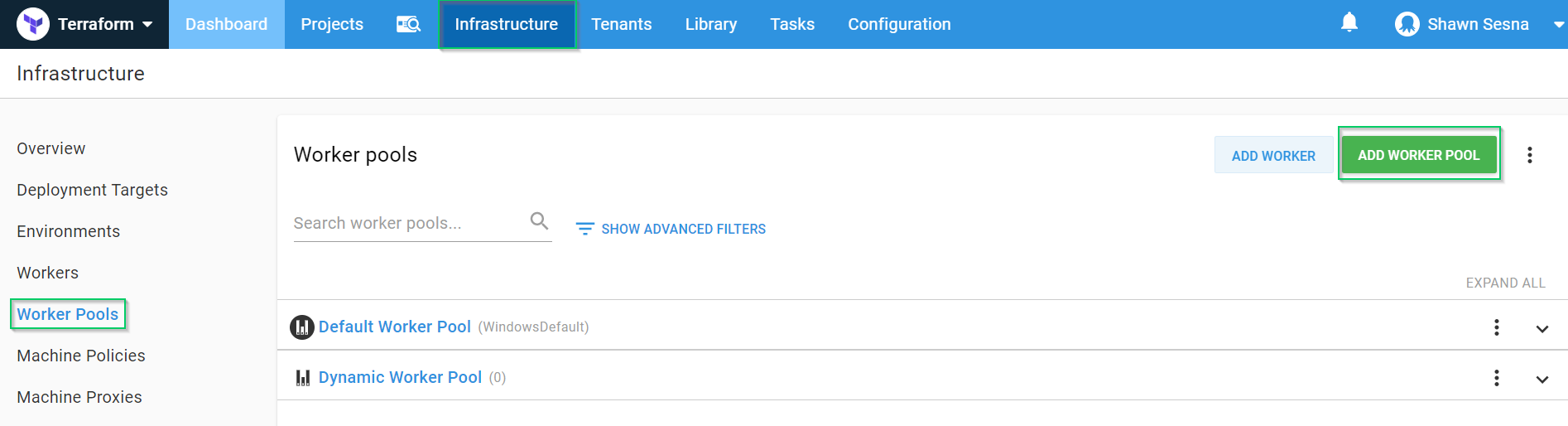 Navigate to {{Infrastructure > Worker Pools > ADD WORKER POOL}}: