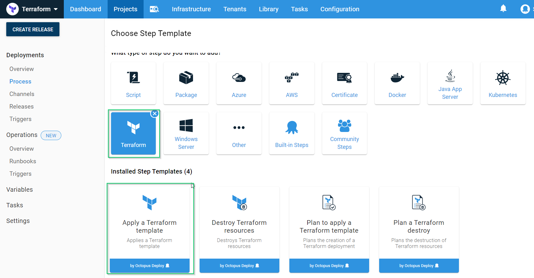 Click the Terraform Category and choose the Apply a Terraform template: