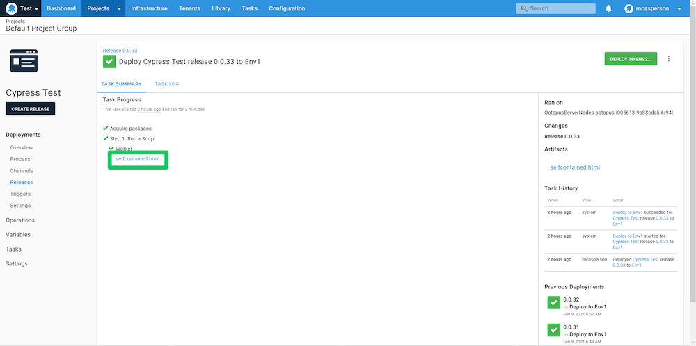 When this script is run, our self-contained HTML report file is captured as an artifact and exposed as a link in the TASK SUMMARY: