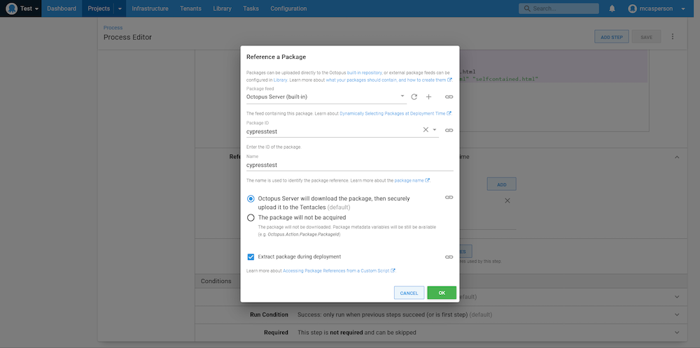 With that, we now have a way to run custom Cypress tests inside the container created by a generic, shared Docker image. To update the tests, we simply upload a new package to Octopus and they will be included in our next deployment.