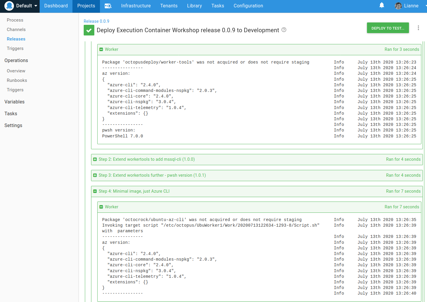 Using this container we can execute an Azure script step and see the same result from az version as against the step that using the octopusdeploy/worker-tools image: