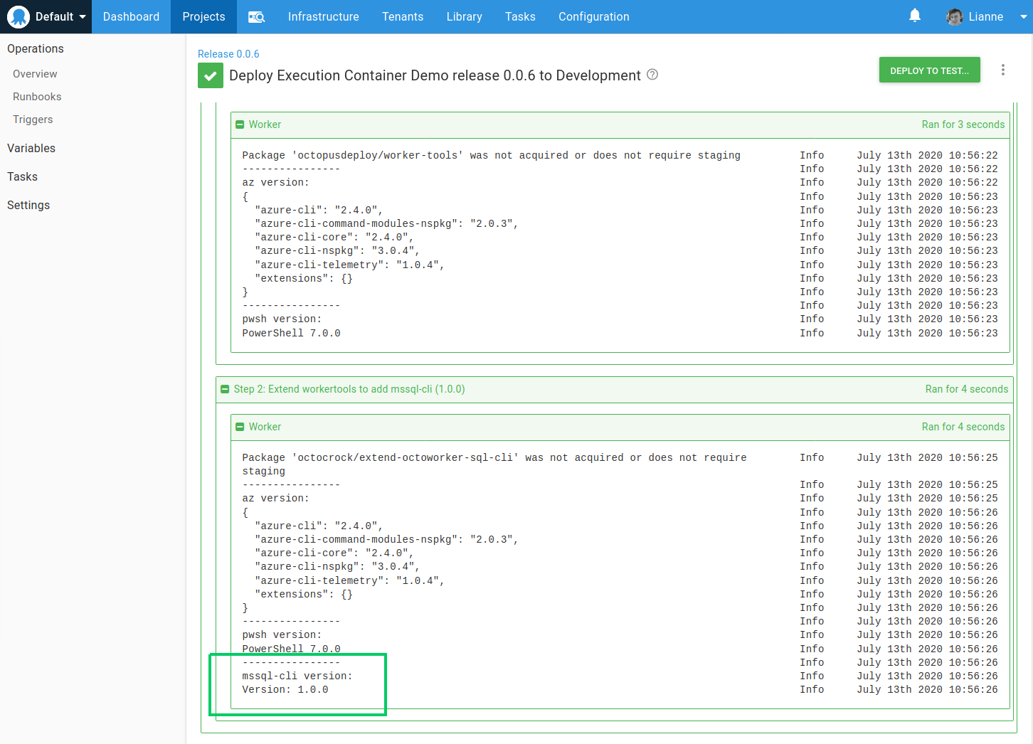 Using it in a basic Octopus step that writes out the version, we can see mssql-cli is there and available: