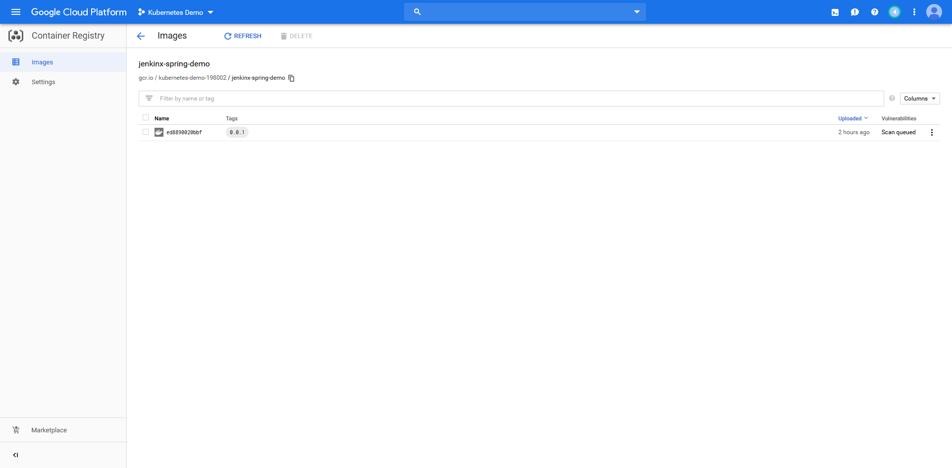 Jenkins X also took care of publishing the Docker image to a local container registry. Because we ran Jenkins X in a Google Cloud Kubernetes cluster, Jenkins X defaulted to using the Google Container Registry. However, had that service not been available, Jenkins X would have installed a Docker registry in the Kubernetes cluster.
