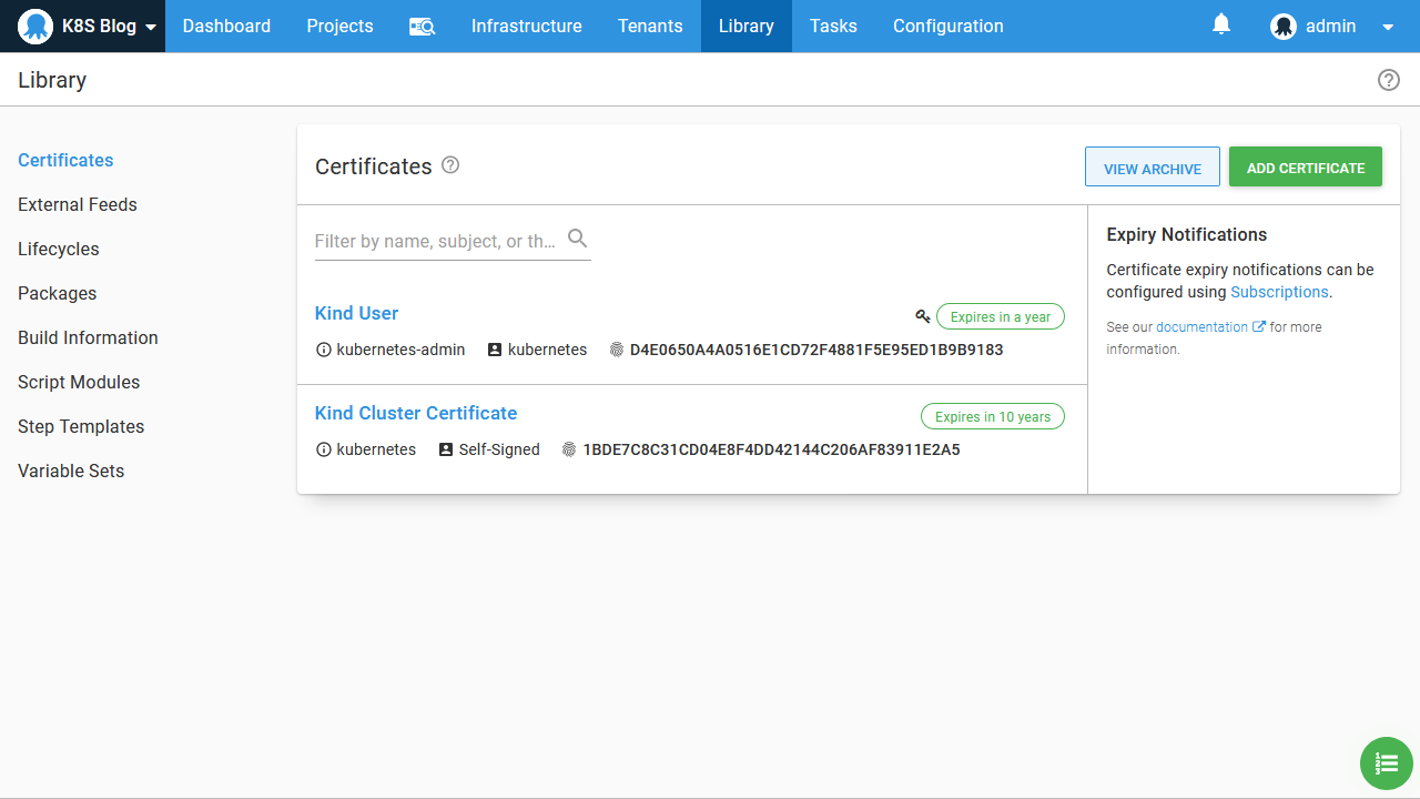 The files cluster.crt and client.pfx are uploaded to the Octopus certificate store. Here I have called these certificates Kind User and Kind Cluster Certificate: