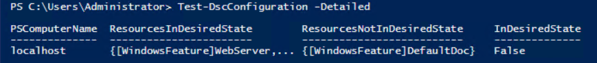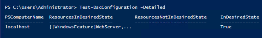 To run a test of the current configuration, you run the Test-DscConfiguration cmdlet. If the configuration is in the desired state, Test-DscConfiguration returns True, if something has drifted, it returns False. Passing the -Detailed argument will return a list of resources both in and out of drift:
