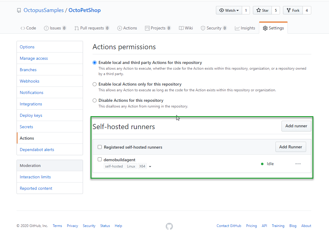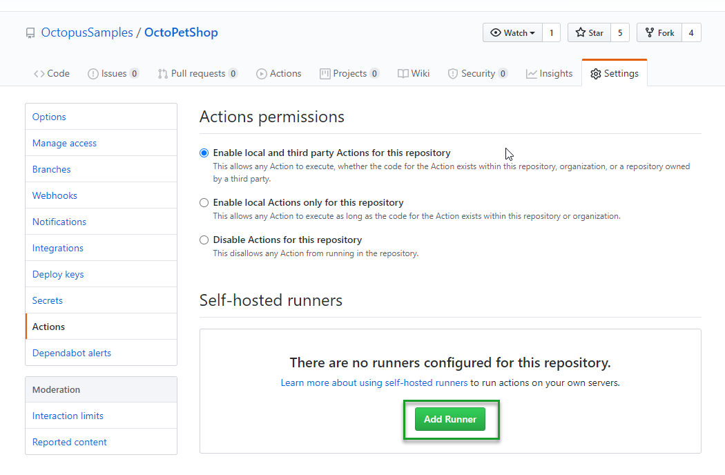 GitHub-Hosted runners are pre-packaged with a lot of functionality, but there are times when you have specific software needs, need the ability to control the version that you are using, or need the runner to have access to on-premises resources such as Octopus Deploy. To solve this problem, the folks over at GitHub developed the ability for Actions to have locally hosted runners. The local runner works in a similar fashion to Octopus Polling Tentacles in that they reach out to GitHub Actions instead of GitHub Actions reaching in.