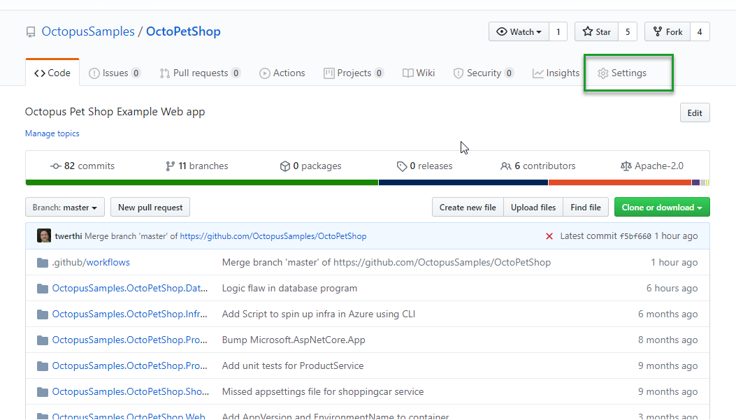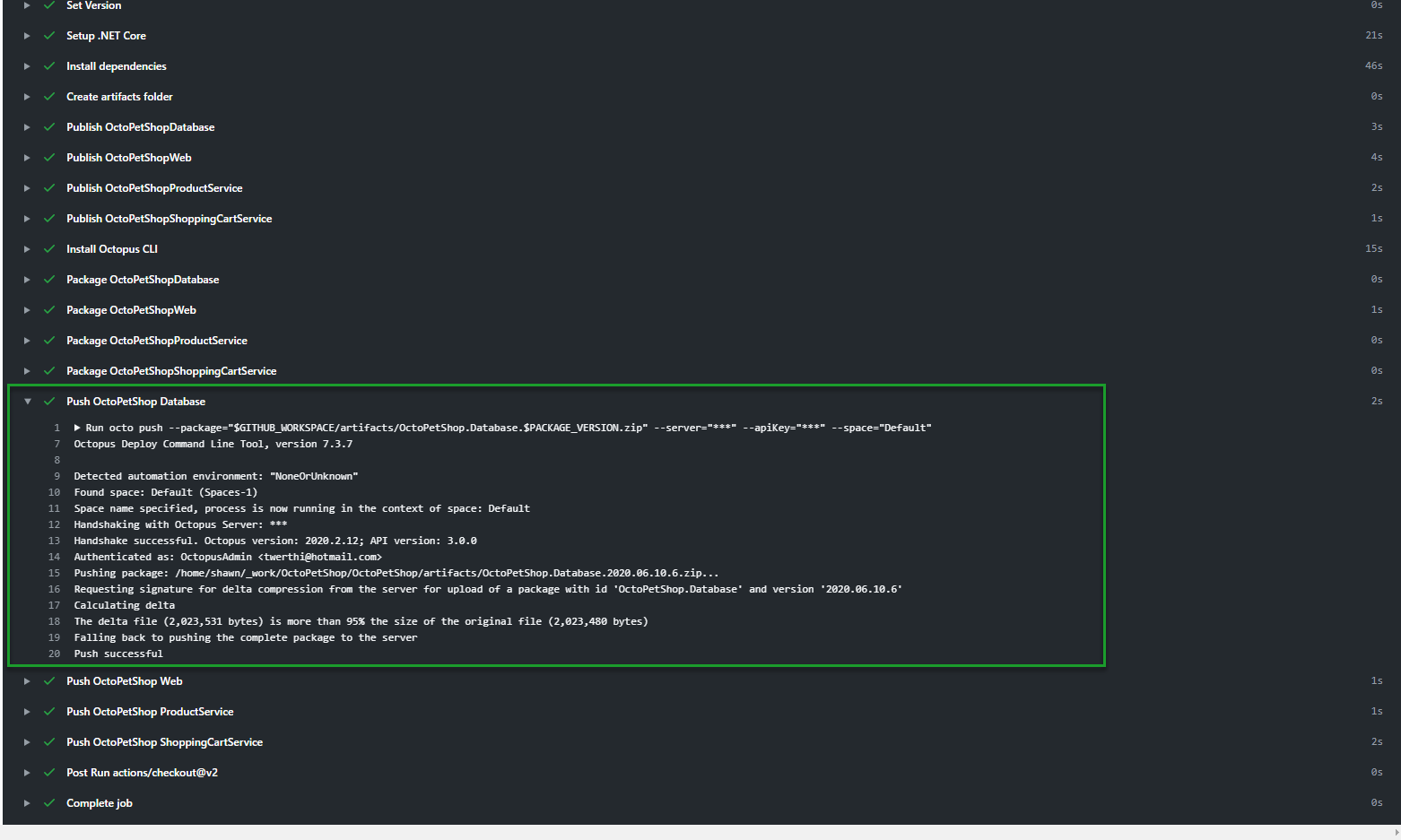 This example builds the OctoPetShop Sample .NET core application, then pushes the packages to our Octopus Deploy Samples instance: