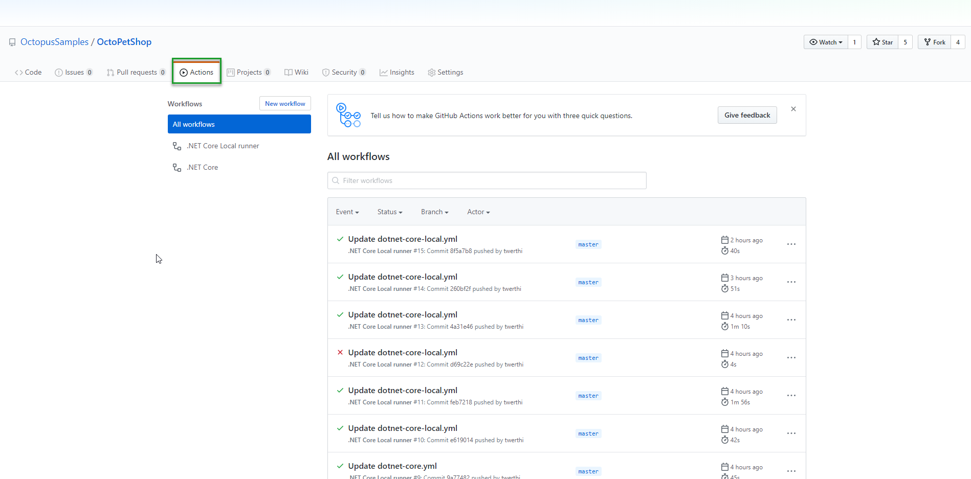 With our workflow configured to use a local runner, we now can push packages to our local instance of Octopus Deploy. By making the change to the YAML file, it kicked off a build, and I can see that my local runner has picked it up by clicking on Actions: