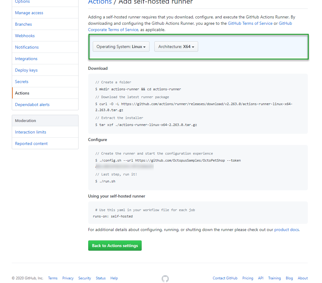 The next screen gives you the option to choose the local runner architecture, and then provides the commands necessary to download and configure it:
