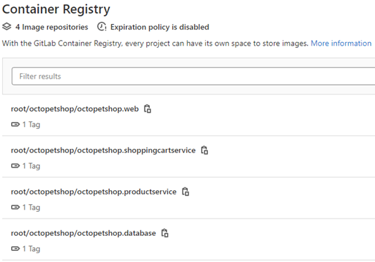 Along with package registries, GitLab also has a container registry. To demonstrate using a container registry, you can again use the OctoPetShop application: