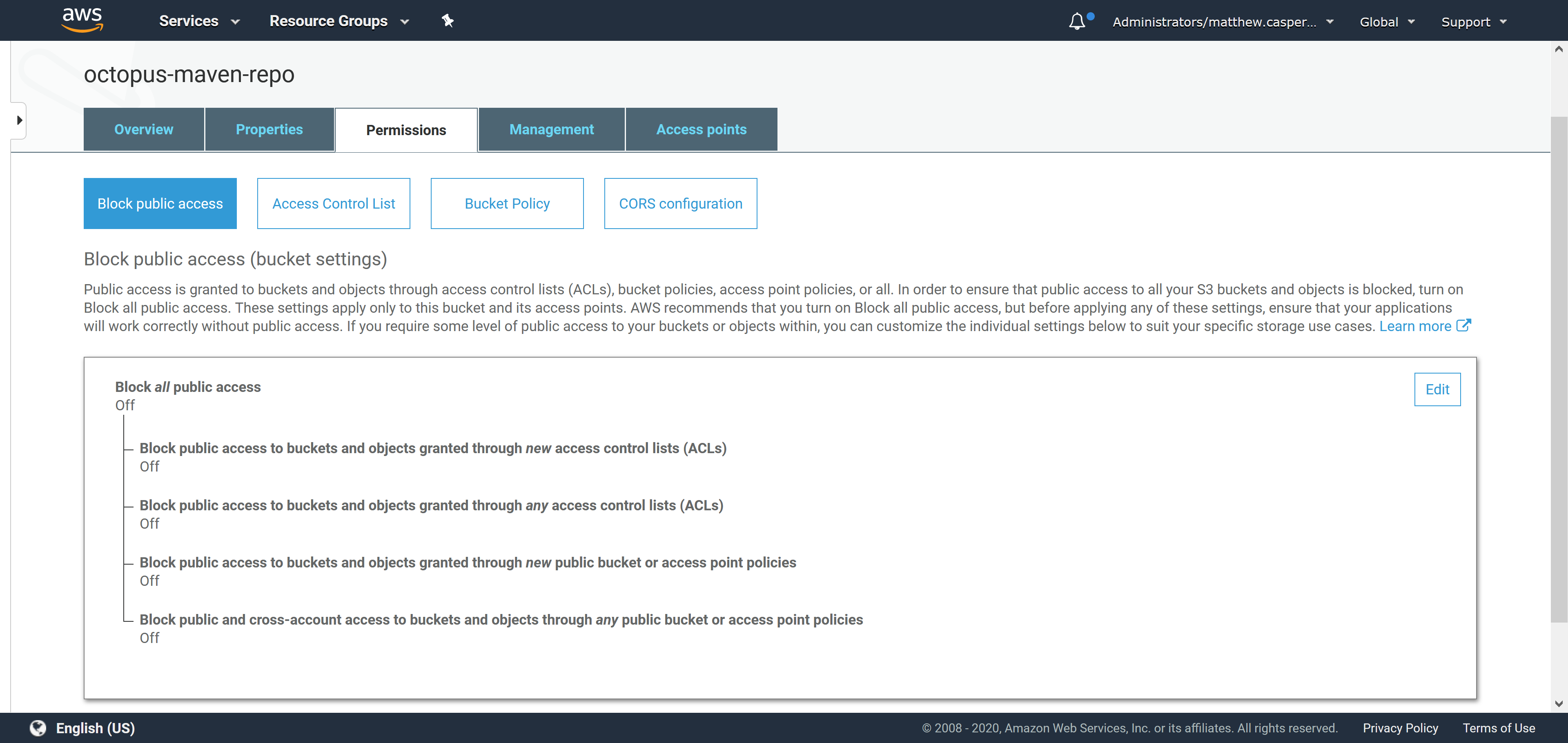 We need to create an S3 bucket called octopus-maven-repo, and create a user that can access the files in the bucket. The following IAM policy grants an IAM user full access to the octopus-maven-repo bucket: