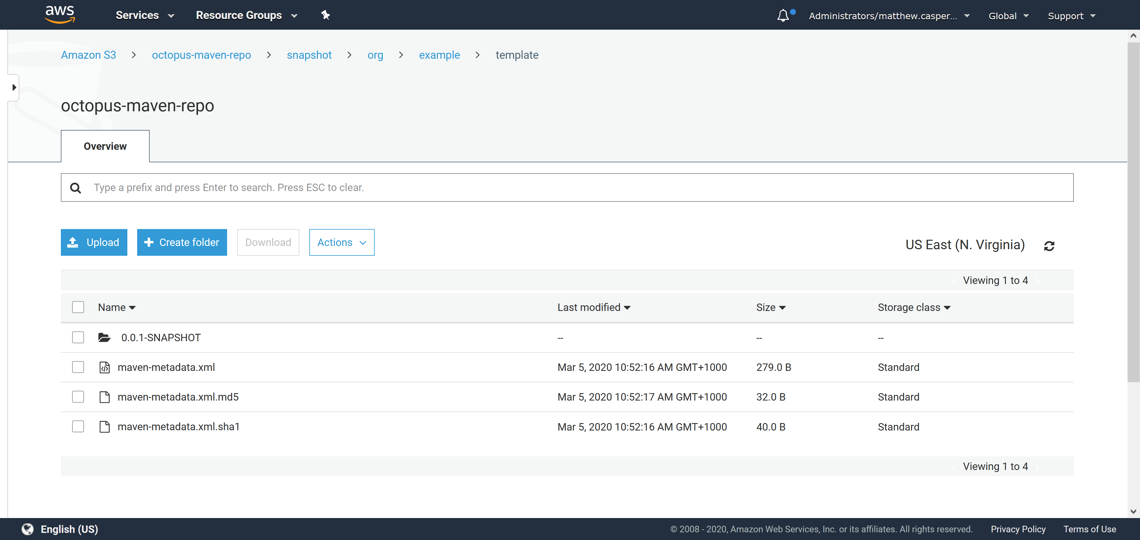 The nice thing about using S3 as a Maven repository is that clients can access it via HTTP. Because we configured our repository to be public, Maven clients (like Octopus) can access artifacts via the HTTP URL https://octopus-maven-repo.s3.amazonaws.com/snapshot.
