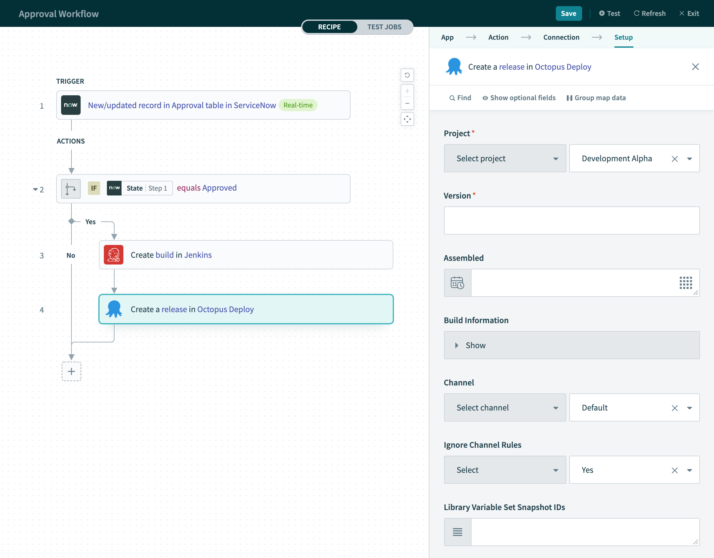 In this workflow, real-time approval events from an instance of ServiceNow trigger a series of actions. Specifically, a build in Jenkins starts, followed by the creation of a release in Octopus Deploy. Conditions may be checked and used to drive decisions as part of the workflow. These are similar to control flow statements like if-then-else statements in programming languages.