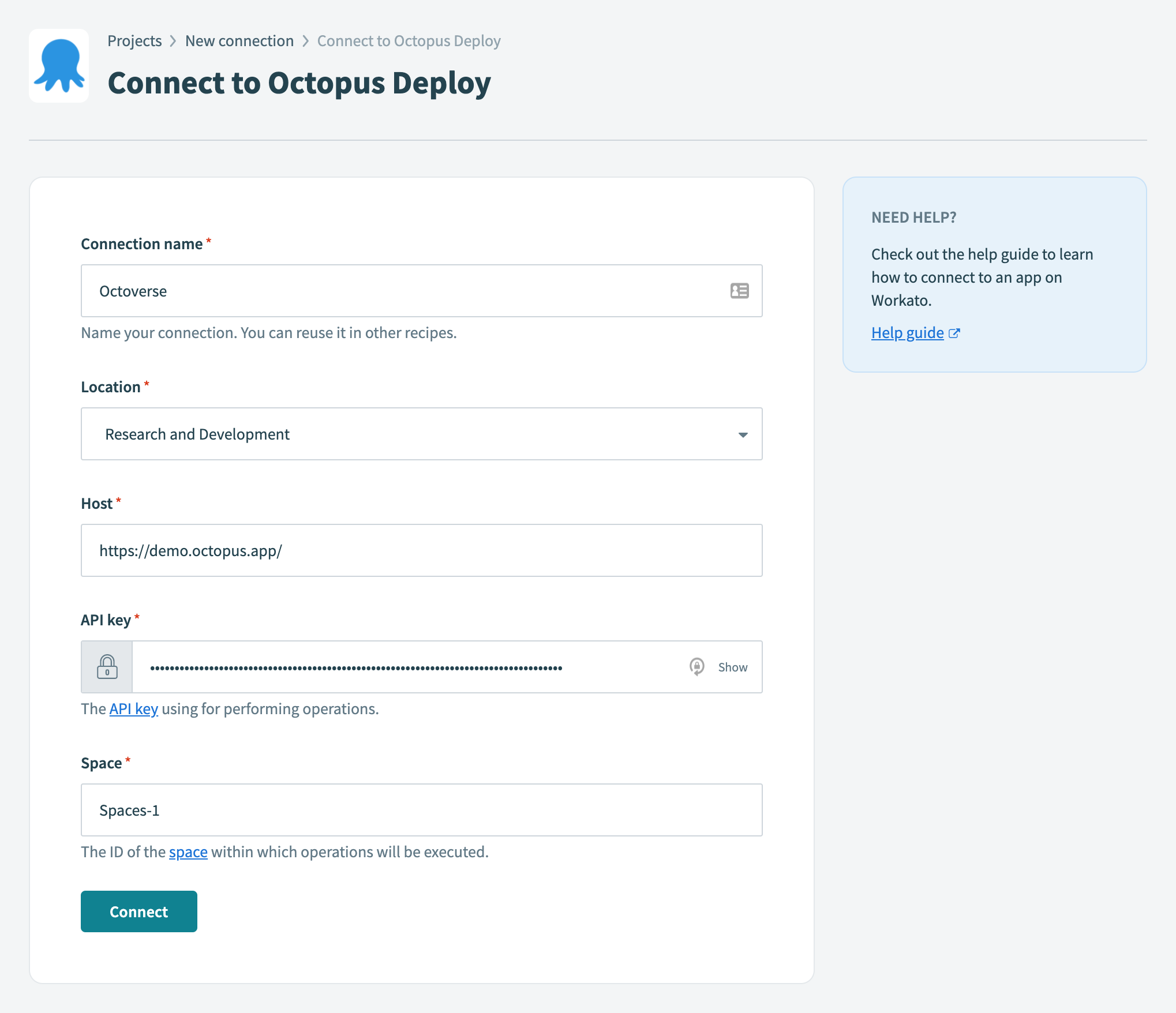 After creating an API key, you need to establish a connection between the Octopus Deploy connector in Workato, and the instance of Octopus you wish to integrate in a workflow: