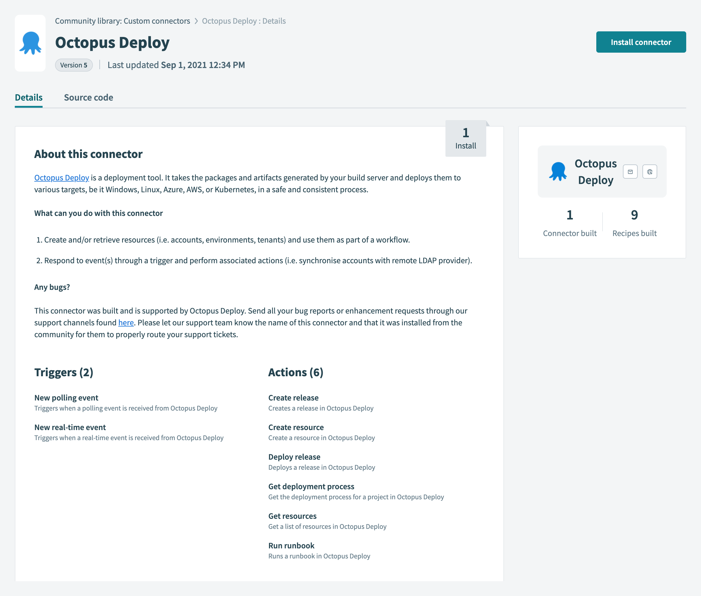 Octopusin the Custom connectors section of the Workato Community library. Navigating to the connector will provide its description along with its source code. - To use the connector, click the Install connector button.