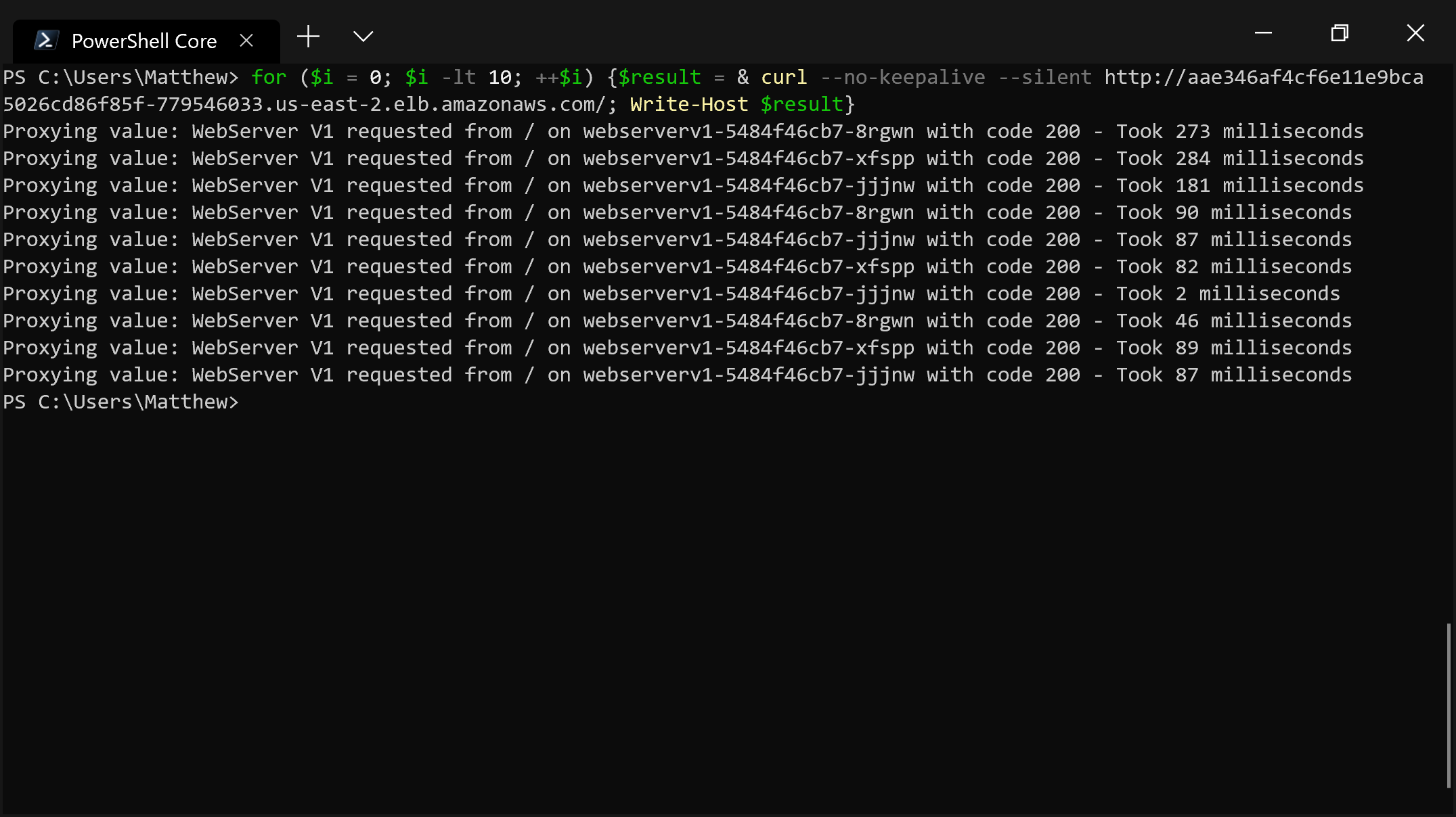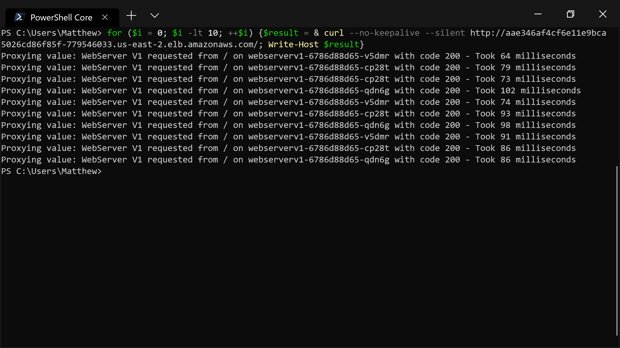 Note that you have to disable keepalive connections to see this pattern. If you open the URL in a browser, you won’t see the clear cycling through targets because browsers enable keepalive connections. Also, it is a known issue that some targets are used twice, which you can see in the output below with the call to webserverv1-6786d88d65-cp28t. These issues are all discussed here.