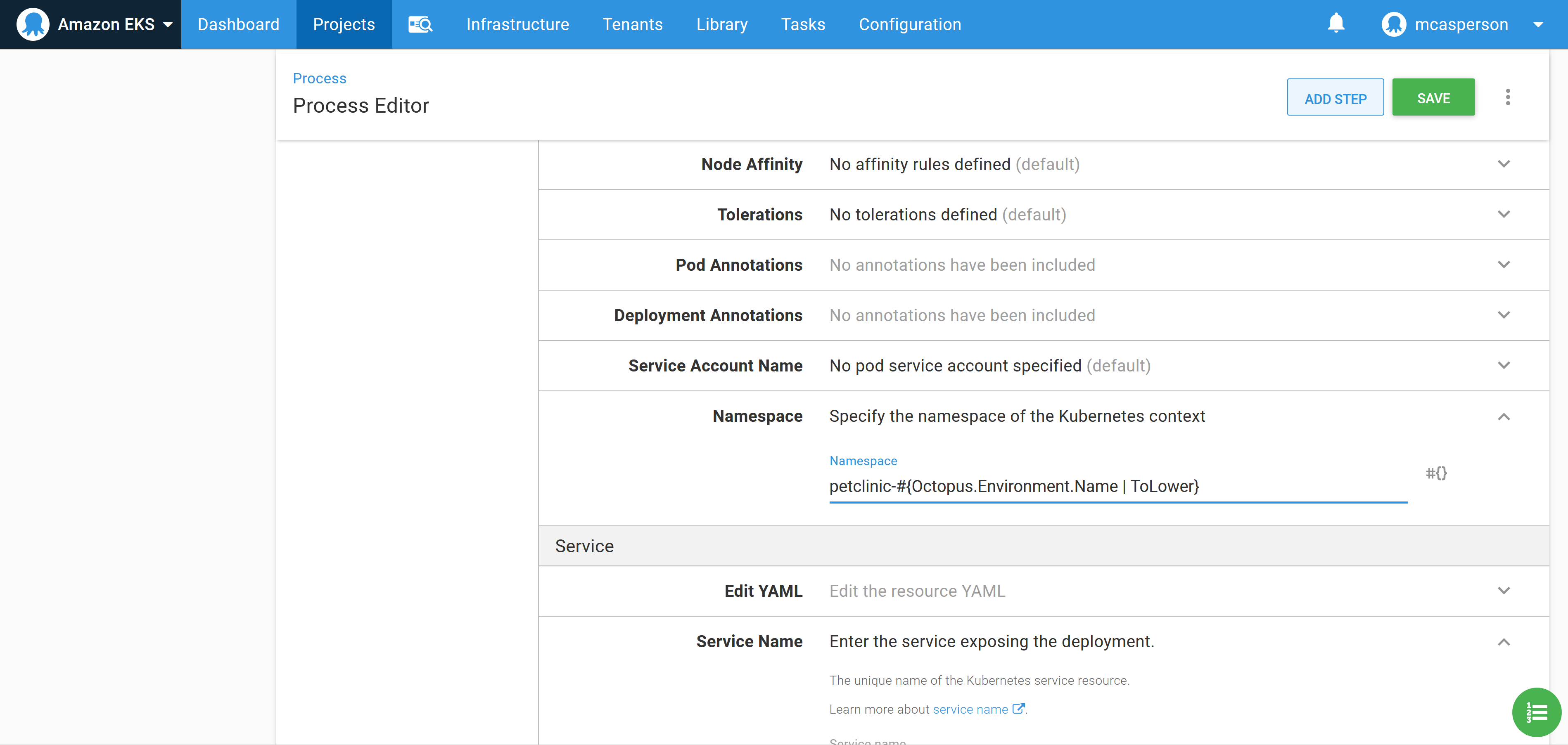 We want to place our deployments into a separate namespace for each environment. This is done by setting the Namespace field to petclinic-#{Octopus.Environment.Name | ToLower}:
