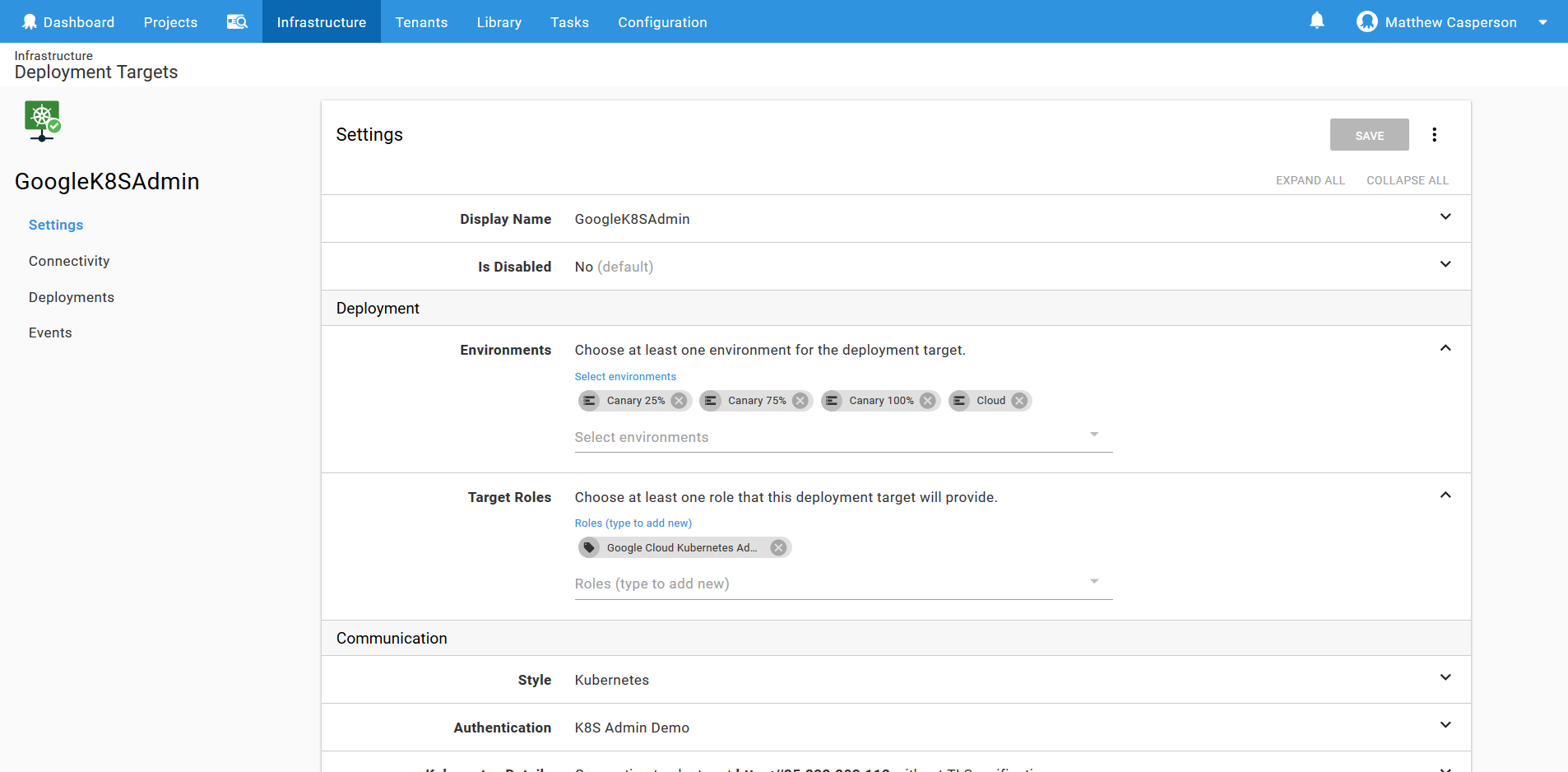 To follow along with this blog post, you will need to have a Kubernetes cluster, and a Kubernetes target in Octopus configured with administrative credentials. I’ll be using a Google Cloud Kubernetes cluster and an admin Kubernetes target with the Google Cloud Kubernetes Admin role.